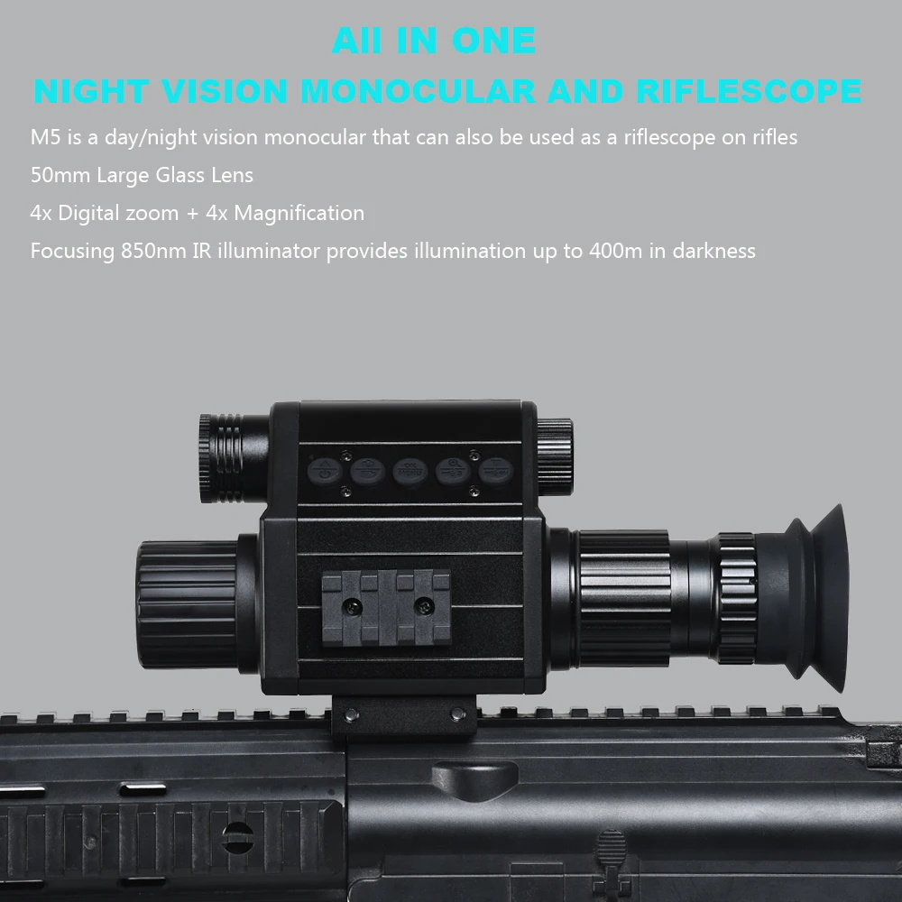 1, MONOCULAR Y RIFLESCOPIO DE VISIÓN NOCTURNA todo EN 1:M5 es un monocular y mira telescópica de visión nocturna, todo en uno, visión nocturna definitiva integrada. Es ideal para caza, vigilancia, observación de animales de cerca y largo alcance durante el día o en completa oscuridad nocturna.