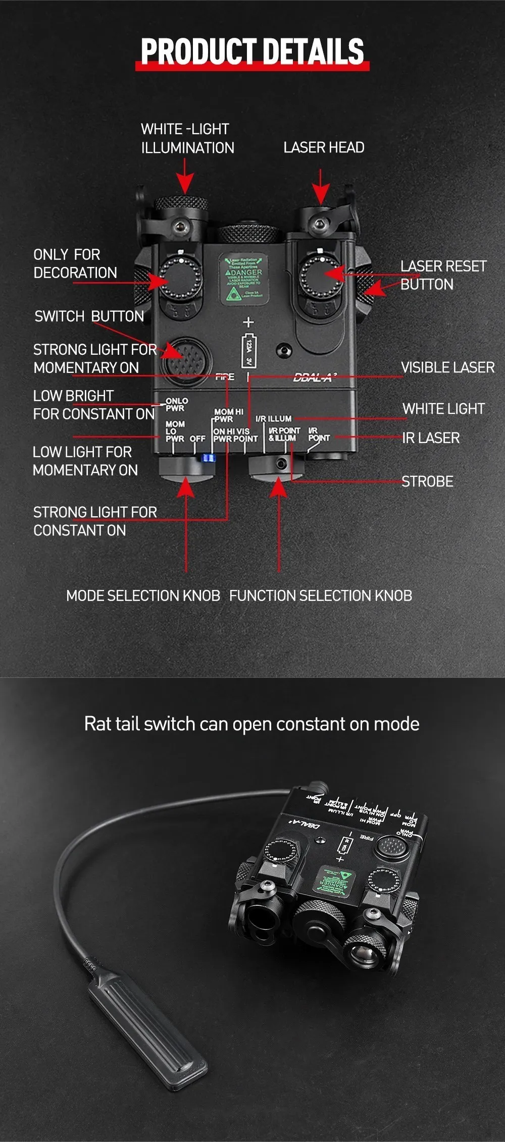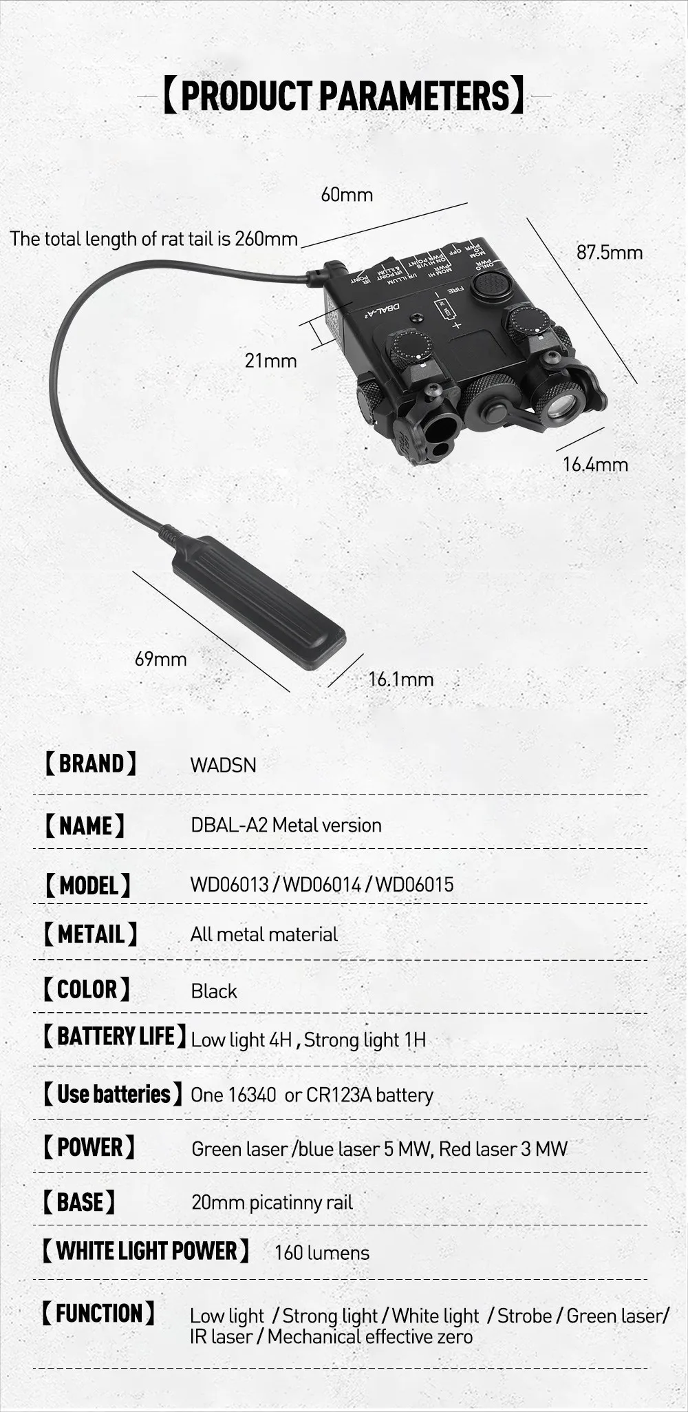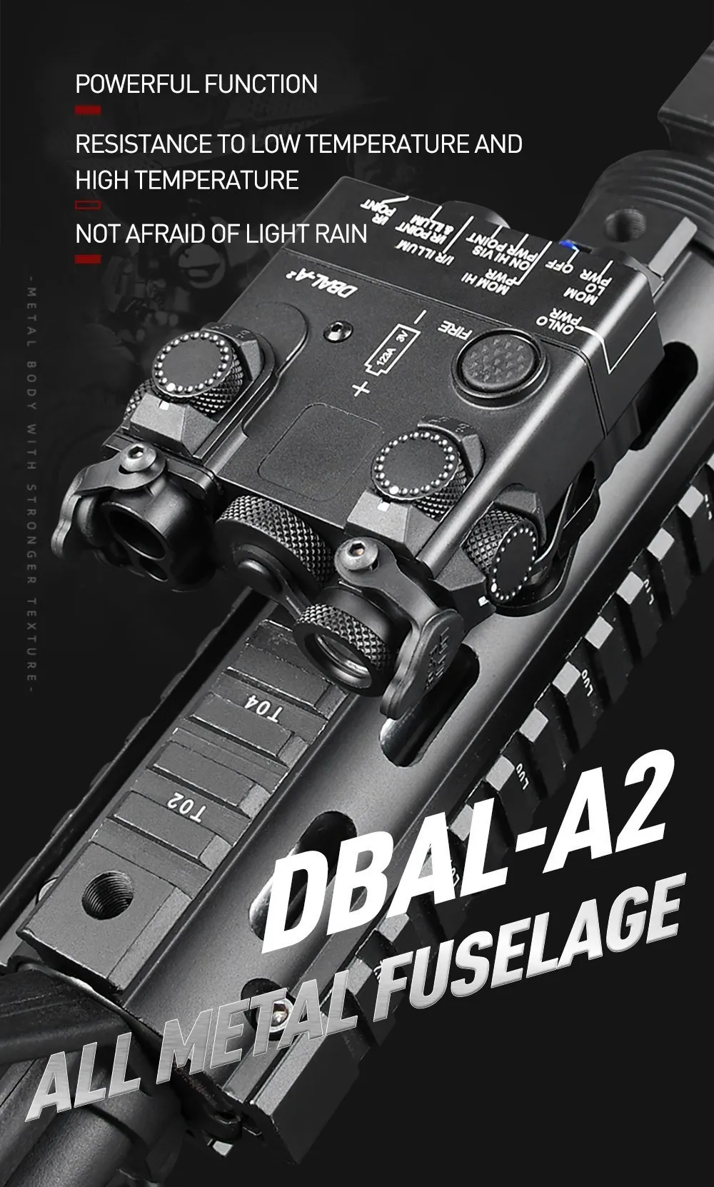 Metal táctico DBAL A2 arma de caza láser rojo verde IR vista Airsoft luz de exploración LED linterna estroboscópica con interruptor PEQ láser