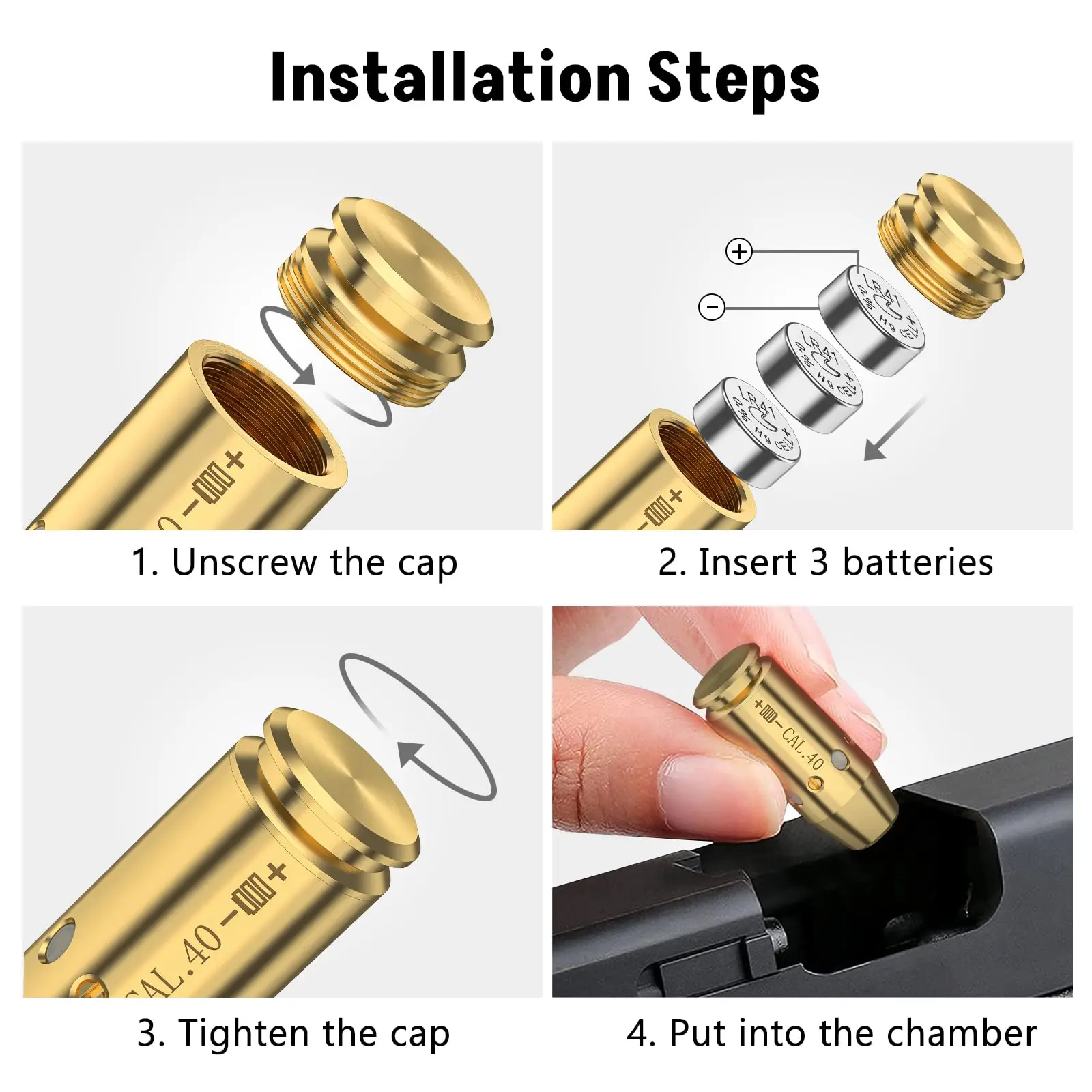 【Fácil de usar】 Inserte 3 baterías, apriete el tornillo y el láser rojo brillante se activa automáticamente. Coloca el visor de calibre. 40 en la Cámara de calibre. 40 y úsalo. No hay interruptor de apagado, Retire las baterías cuando termine de usar el láser de avistamiento de 40 orificios.
