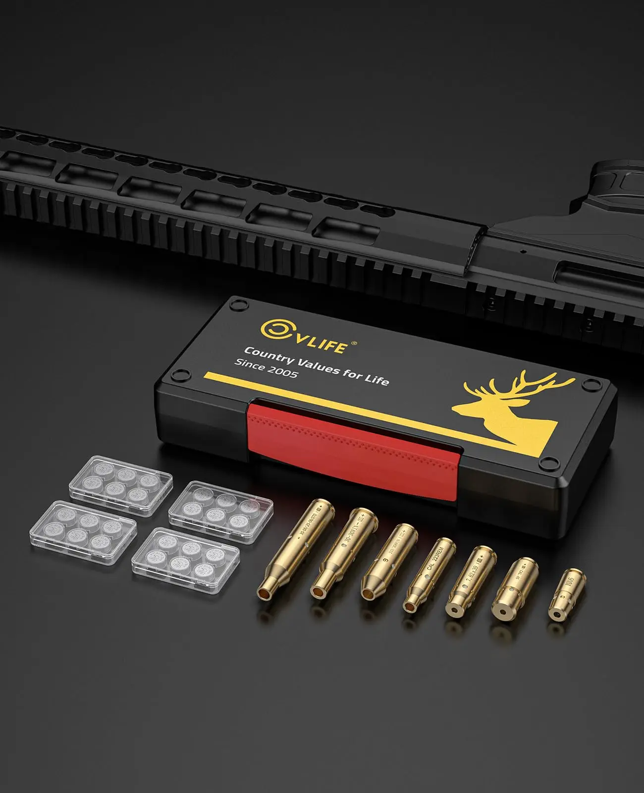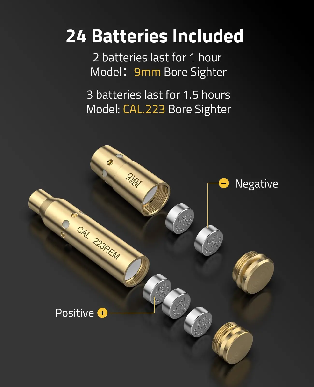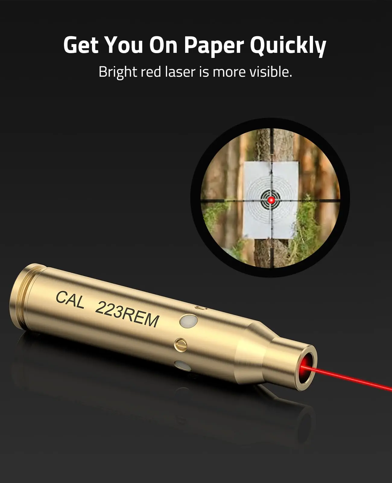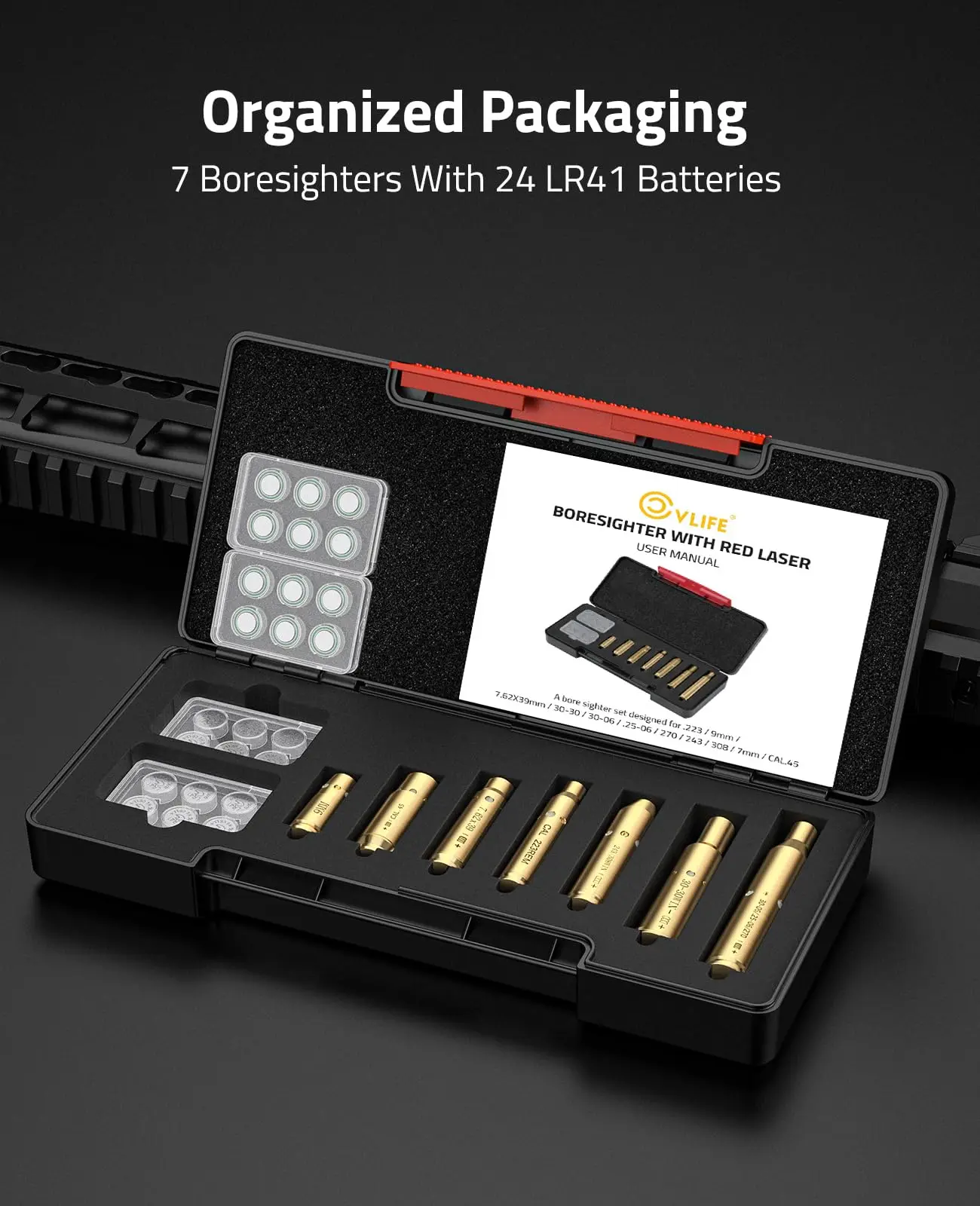 Kit de Boresighter: 7 Boresighters aptos para CAL.223, 9MM, 7.62X39MM, 30-30WIN, 30-06, .243 308WIN, 45ACP respectivamente. Calibre específico. Láser clase IIIA; menos de 5mW.
