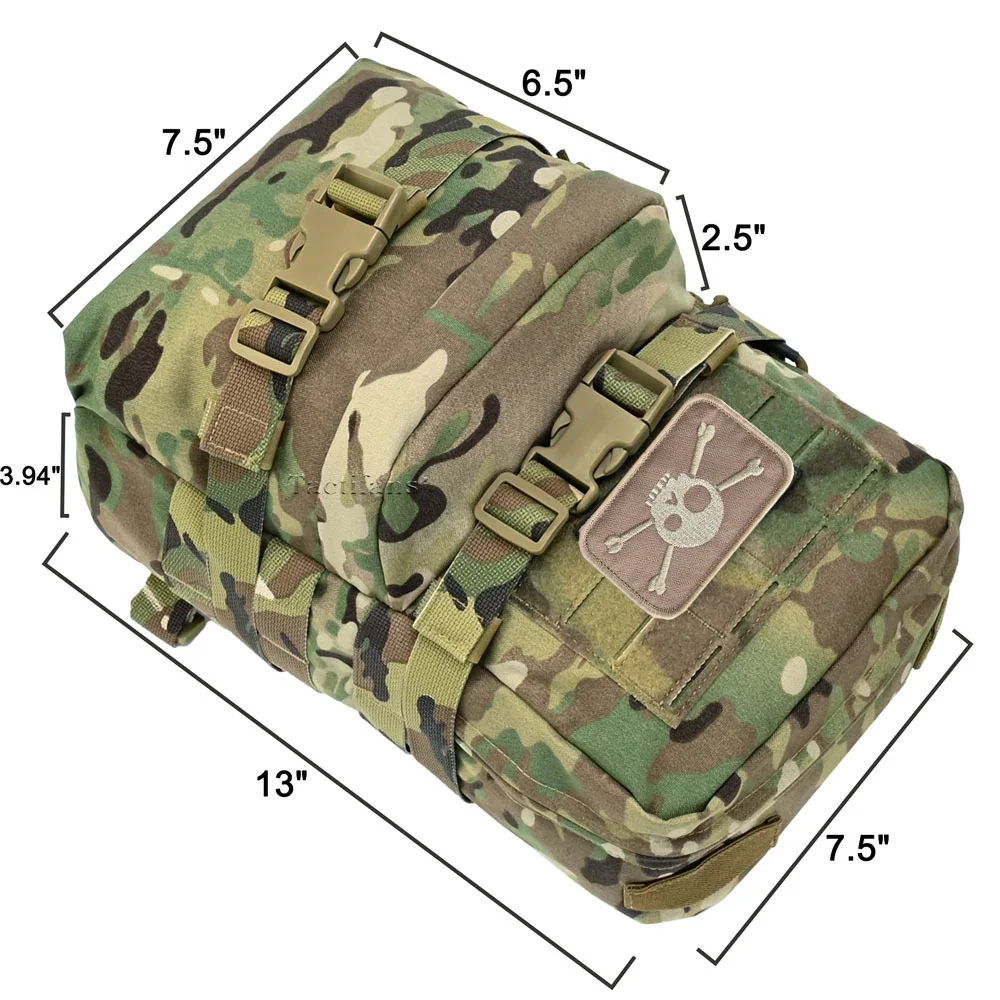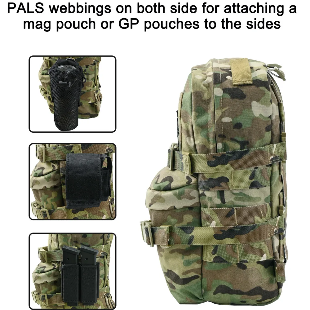 ①[Multi-purpose Tactical Hydration Backpack]:This modular assault backpack is a multi-purpose hydration or assault pack with an internal hydration pocket,a main compartment,front zipper pouch and a extra room for additional inserts.And also you can use it as a independent back(have to buy a harness).