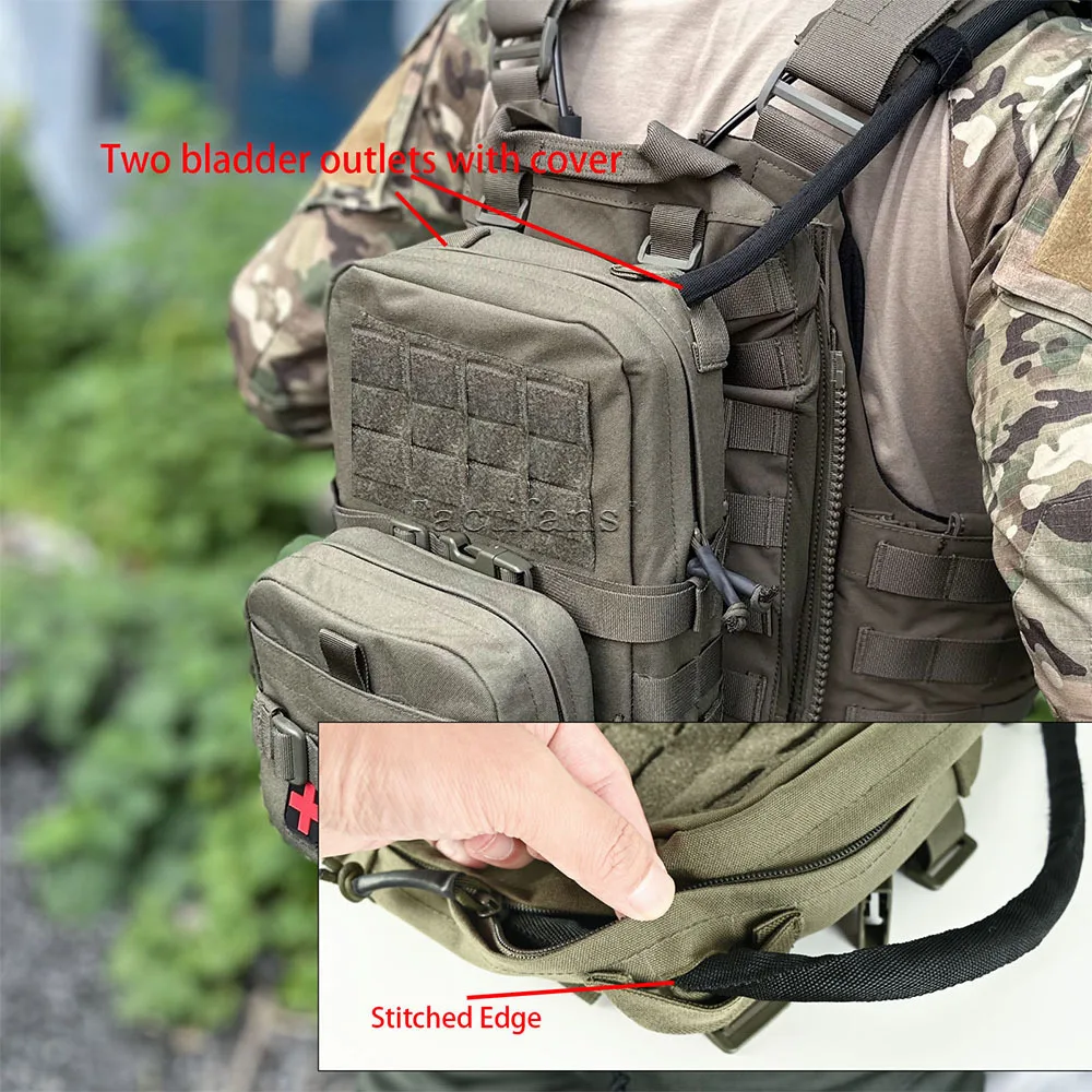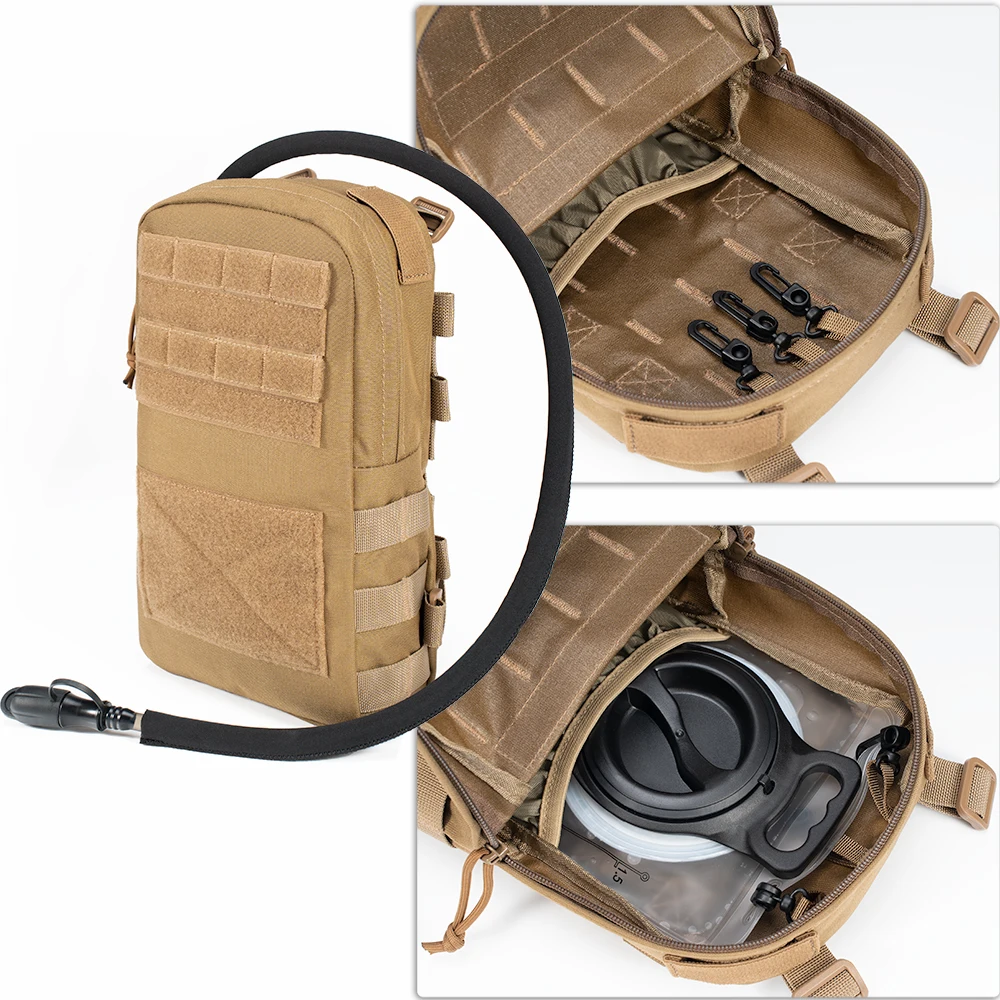[Paquete de hidratación y paquete hidropónico]: una bolsa de agua principal espaciosa para transportar una vejiga de agua de 1,5-2 litros.Dos salidas de vejiga con tapa con protector en la parte superior del paquete de hidratación, por lo que la tubería de agua se puede cambiar de posición hacia el lado izquierdo o derecho en cualquier momento.Cuenta con un panel molle de gancho y bucle en la parte frontal de la mochila que utiliza correas debajo del panel para hacerlo más duradero y perfecto para transportar una bolsa de administración molle/soporte para teléfono/bolsillo EDC/bolsa de herramientas Molle