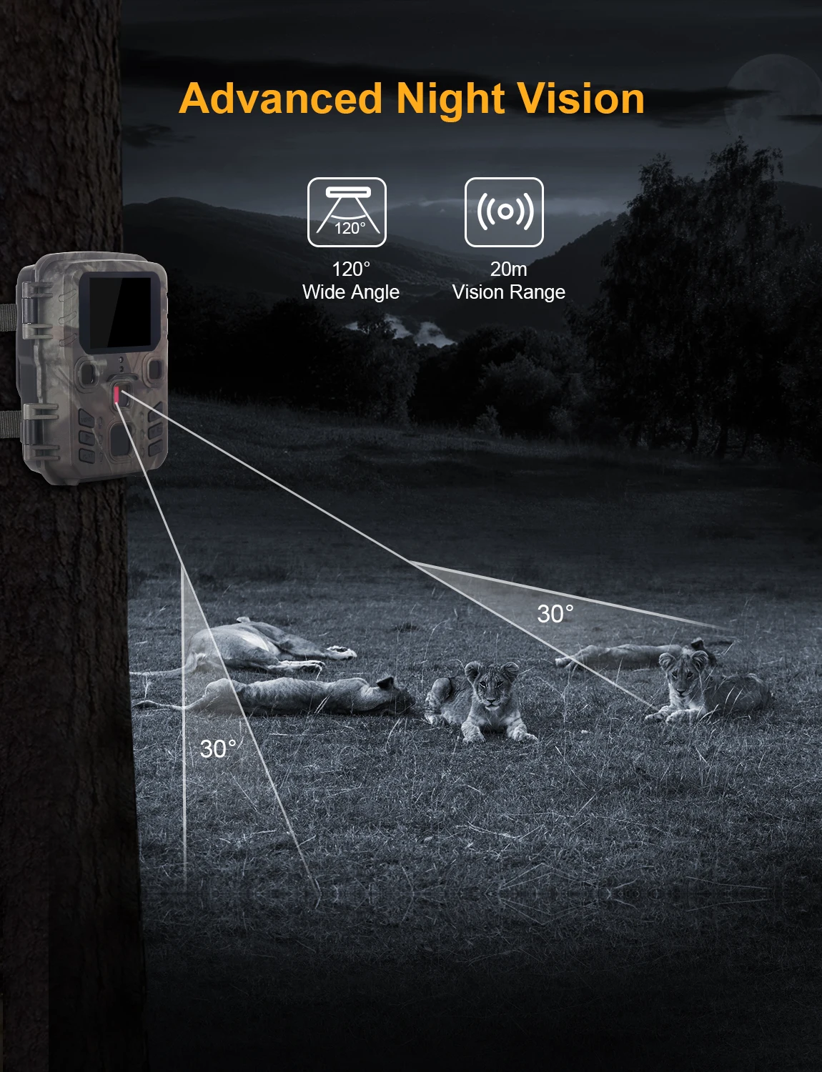 Con tiempo de disparo súper rápido de 0,45 segundos, altamente sensible 40°Sensor PIR, distancia de disparo efectiva de 65 pies, filtro IR completamente automático y 2 LED IR de alta potencia de 850 nm, alcance de flash IR de 65 pies, las cámaras de juego activadas por movimiento nunca pierden ninguna acción detectada, sin importar el día y la noche.