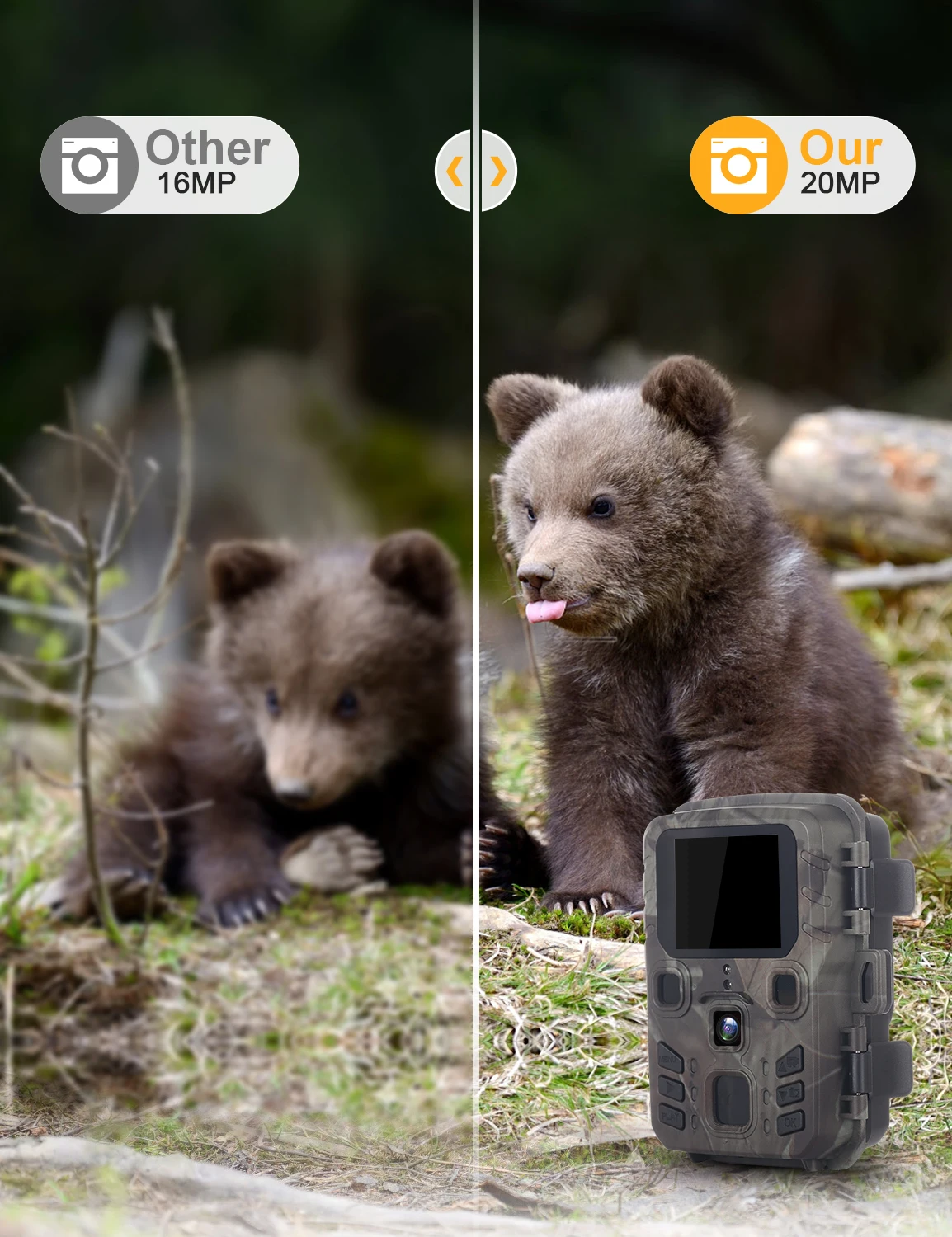 Cámaras de seguimiento HD con captura de visión nocturnaVídeos Full HD de 1080P con sonido claro e imágenes claras y coloridas de 20MP durante el día e imágenes en blanco y negro durante la noche(Hasta 3 instantáneas por detección).Cámara ideal para vigilancia de vida silvestre al aire libre.