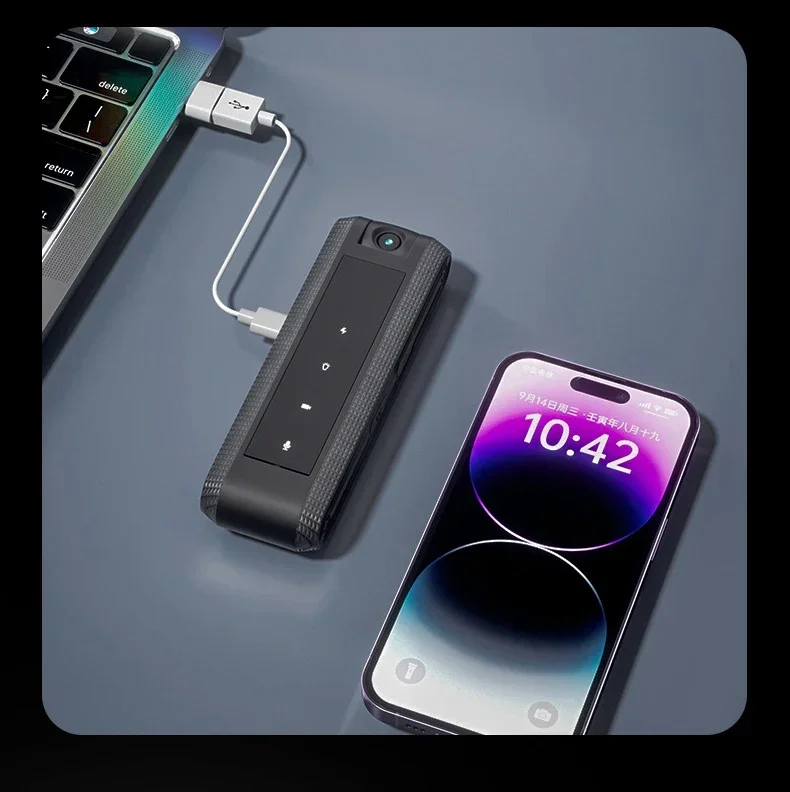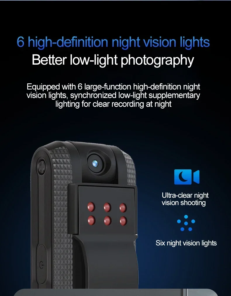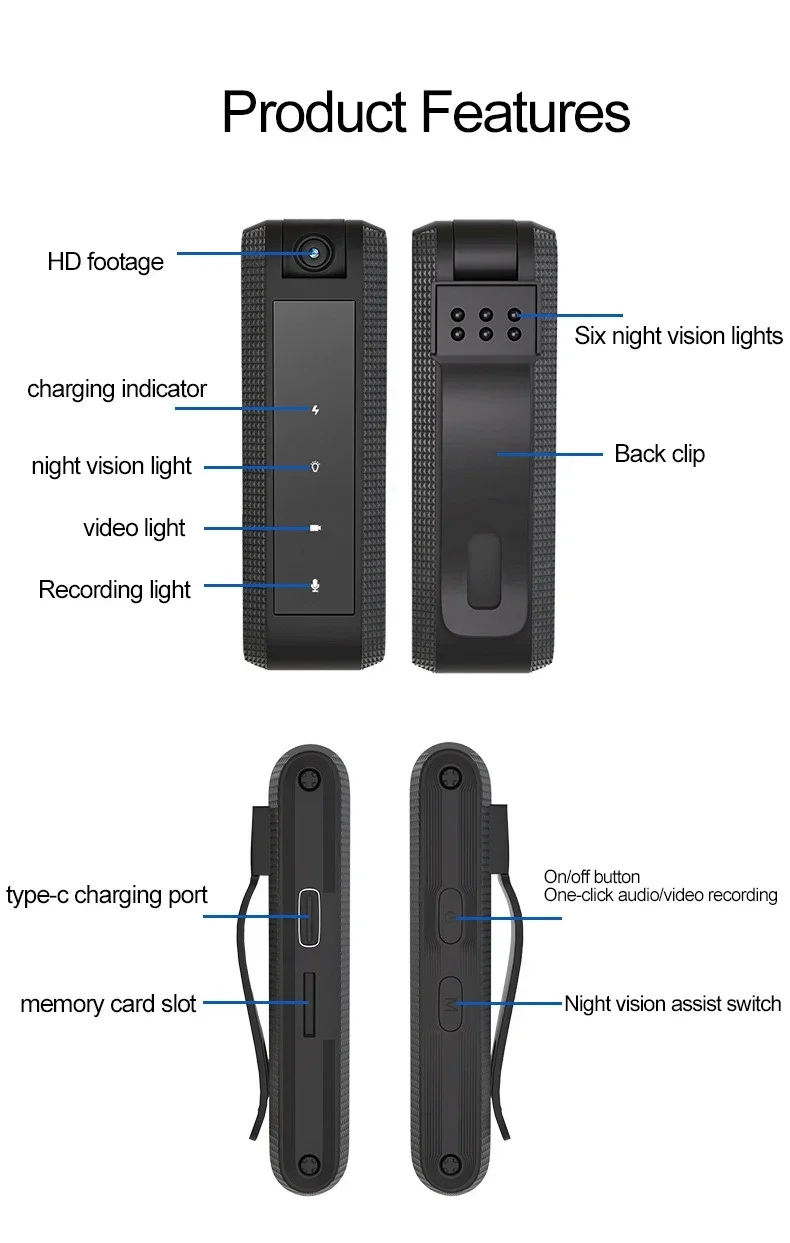 Imágenes HDIndicador cargaLuz de visión nocturna-Luz videoLuz de grabaciónSeis luces de visión nocturnaClip traseroPuerto de carga tipo CRanura para tarjeta de memoriaBotón de encendido/apagado Grabación de audio/video con un clic Interruptor de asistencia de visión nocturna