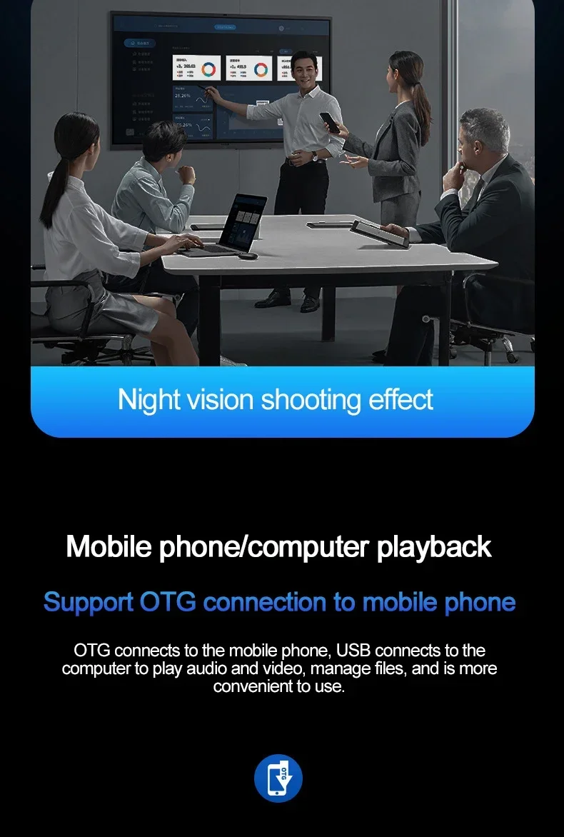 Efecto disparo de visión nocturnaReproducción de teléfono móvil/ordenadorAdmite conexión OTG al teléfono móvilEl OTG se conecta al teléfono móvil, el USB se conecta al ordenador para reproducir audio y vídeo, administrar archivos y es más cómodo de usar.