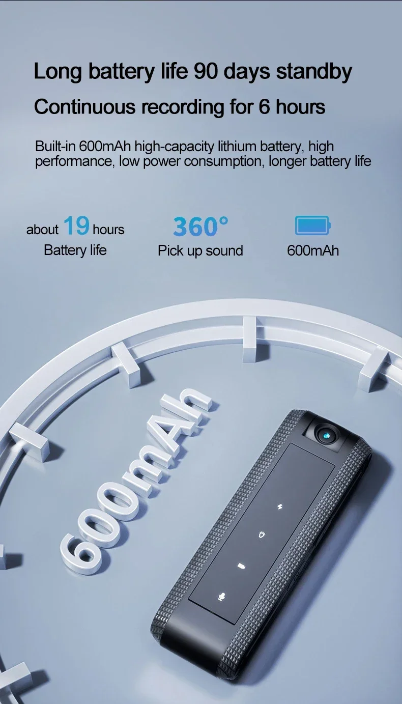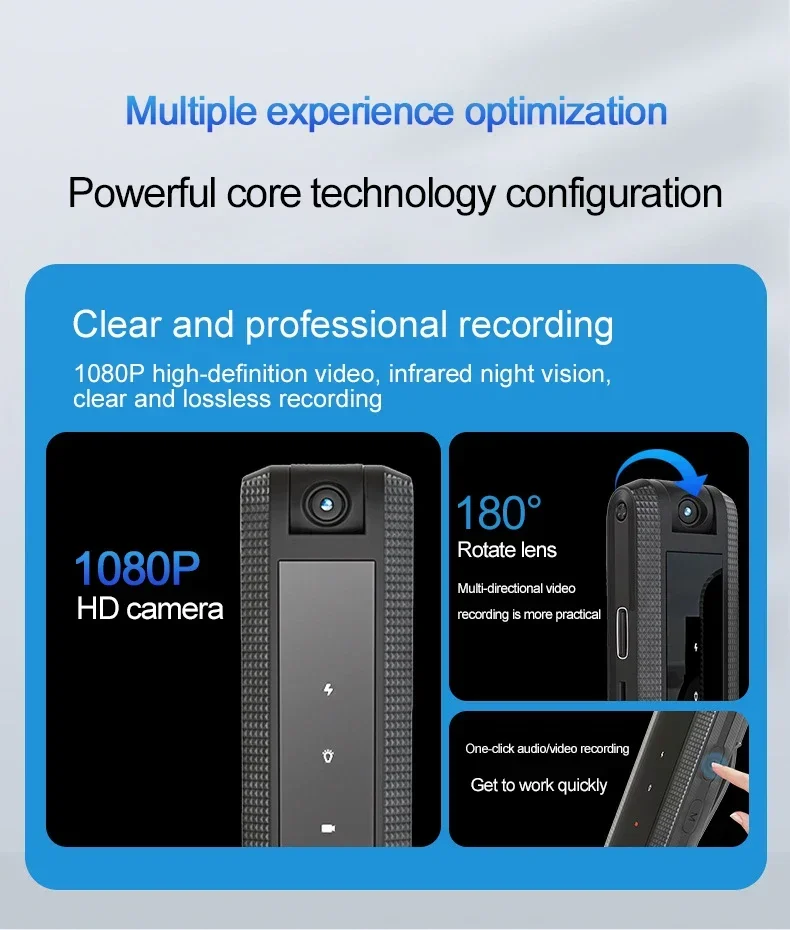 Potente Configuración de tecnología centralGrabación clara y profesionalVídeo de alta definición 1080P, visión nocturna infrarroja, grabación clara y sin pérdidasCámara 1080P HDCaptura para que haya DetallesLente giratoria 180 °La grabación de vídeo multidireccional es más prácticaGrabación de audio/vídeo con un clicPonte a trabajar rápidamente