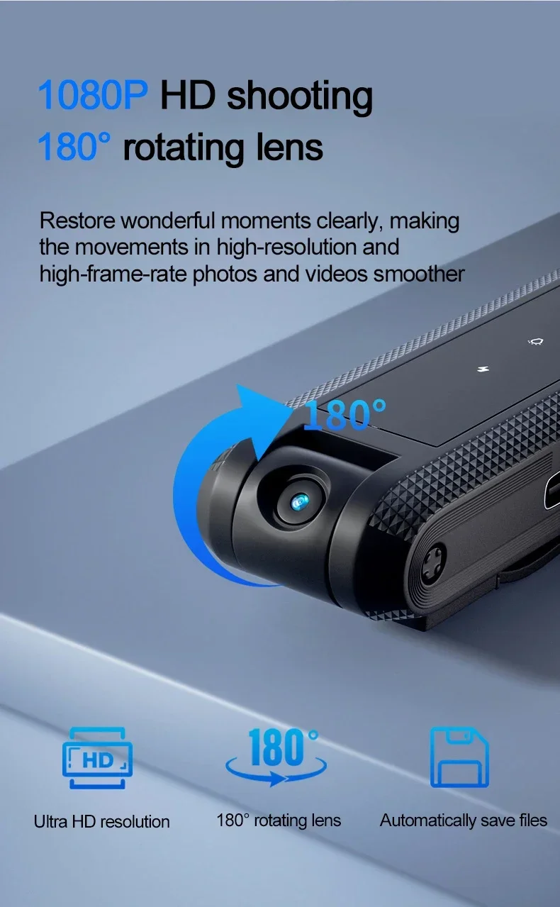 Disparo 1080P HDLente giratoria 180 °Restaure momentos maravillosos con claridad, haciendo que los movimientos en fotos y videos de alta resolución y alta velocidad de fotogramas sean más suavesResolución Ultra HDLente giratoria 180 °Guardar archivos automáticamente