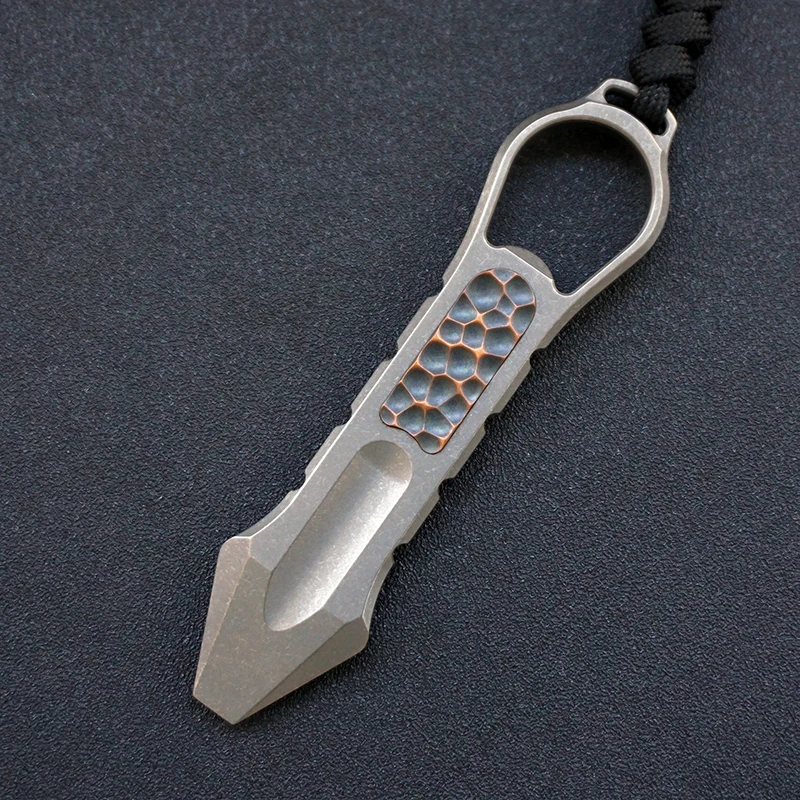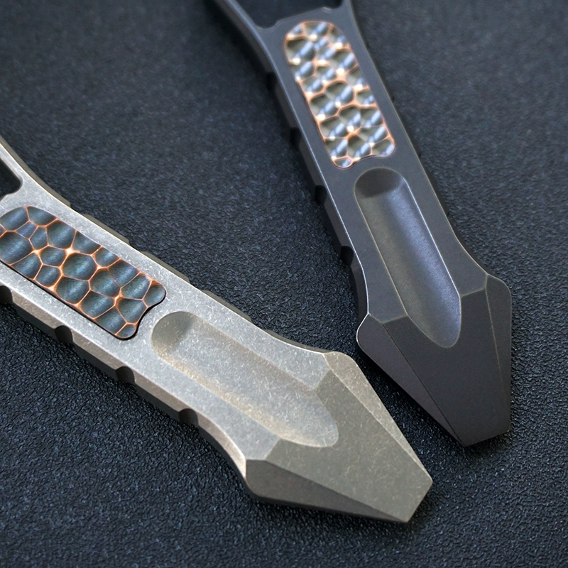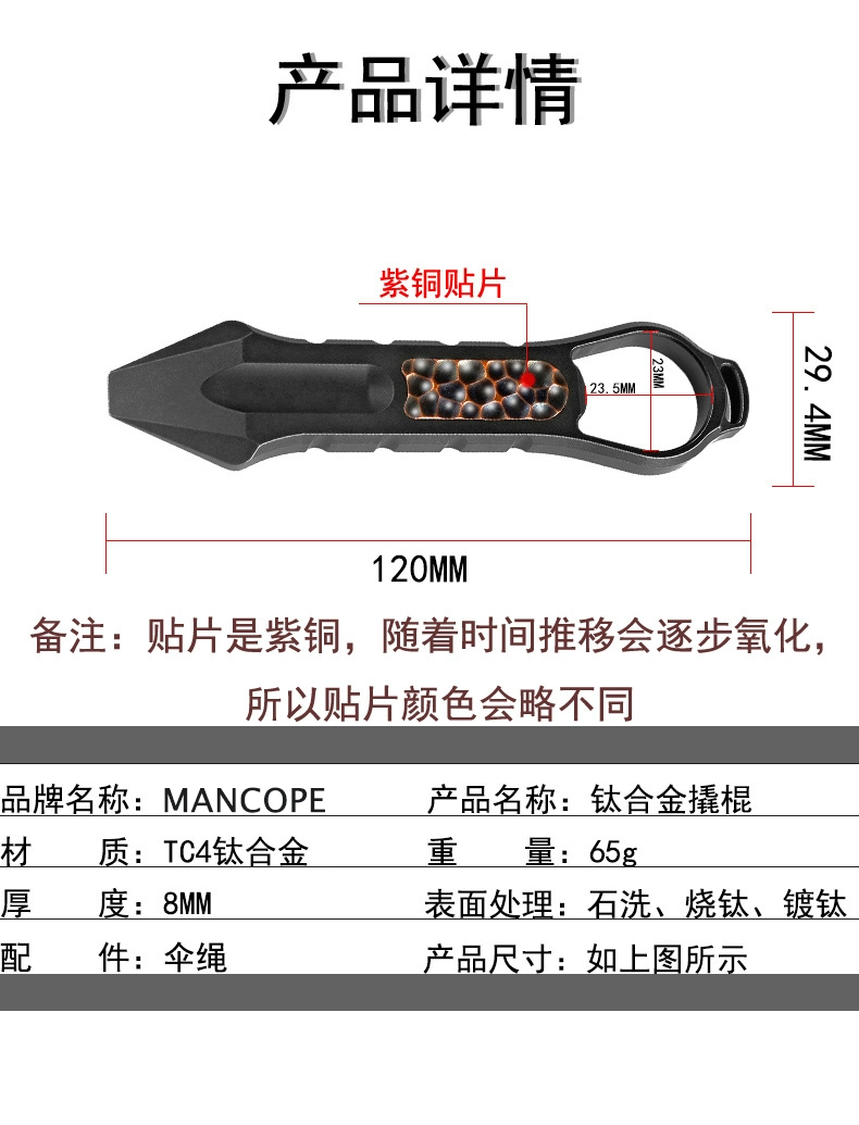 Nota: El parche es de cobre, que se oxidará gradualmente con el tiempo, por lo que el color del parche será ligeramente diferente.Nombre del producto: palanca de aleación de titanioMaterial: aleación de titanio TC4Peso: 65 gGrosor: 8MMTratamiento superficial: lavado de piedra, combustión de titanio, revestimiento de titanio.Accesorios: ParacordTamaño del producto: como se muestra en la imagen de arriba