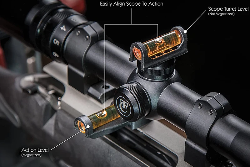 FACILIDAD DE USO: Coloque el nivel de la torreta del alcance en la tapa superior del alcance y el nivel de acción por encima del perno; una vez que los niveles muestren un alcance de nivel, simplemente apriete los anillos hacia abajo