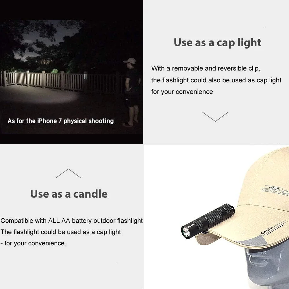 Linterna con clip El clip de acero desmontable hace que la linterna sea muy cómoda de usar.Es adecuado para enganchar en el ala del sombrero y se puede utilizar como faro para liberar las manos al usarlo.