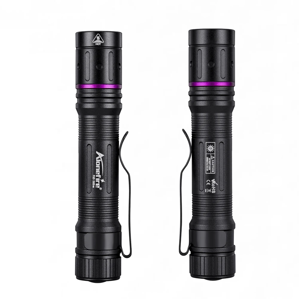 La luz ultravioleta de 365 nm es invisible a simple vista, por lo que no es tan BRILLANTE como la linterna de 395 nm, sino más perfecta para detectar una alta demanda como agentes fluorescentes y códigos de seguridad.UV de 365 nm es el espectro de detección realmente dedicado.Se puede utilizar con luz natural y funciona mejor en la oscuridad con poca fuga de luz visible.Se puede utilizar como detector de orina para mascotas (perros/gato)/escorpión/buscador/fluorescente/detector/moneda/licencia/tarjeta/
