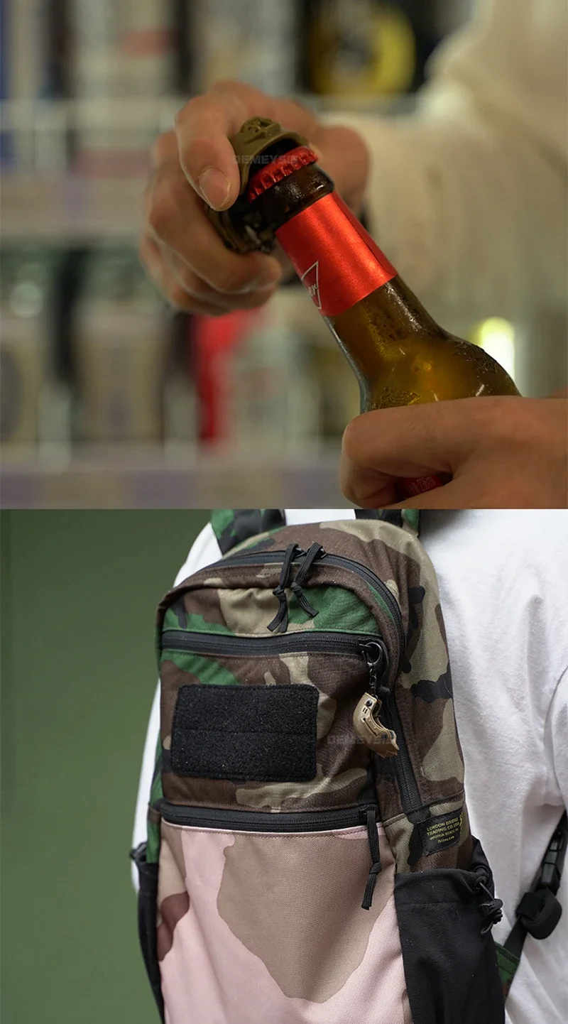 ●Abridor de botellas oculto.Forma de casco táctico, con abridor de botellas en el interior.