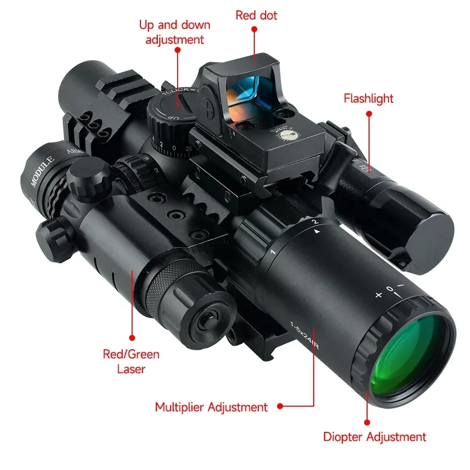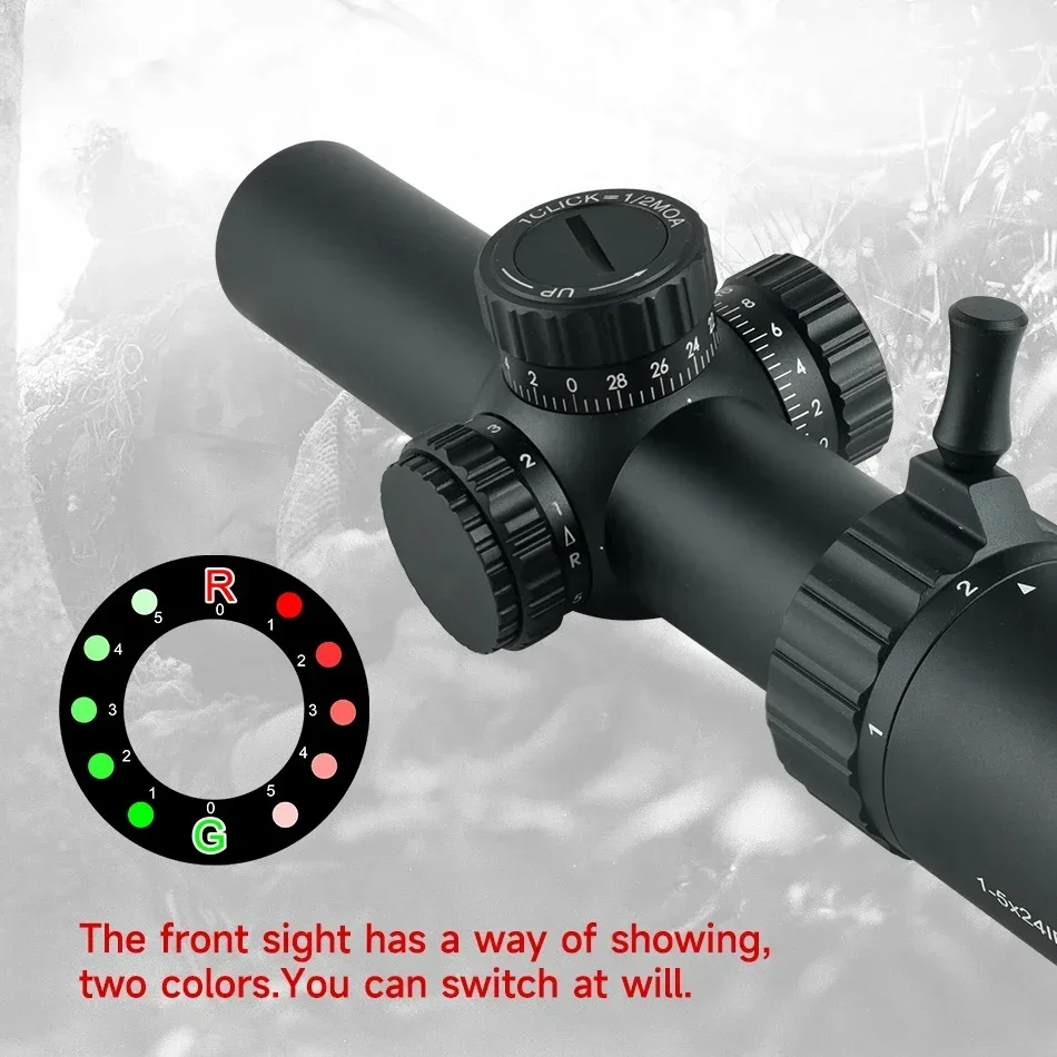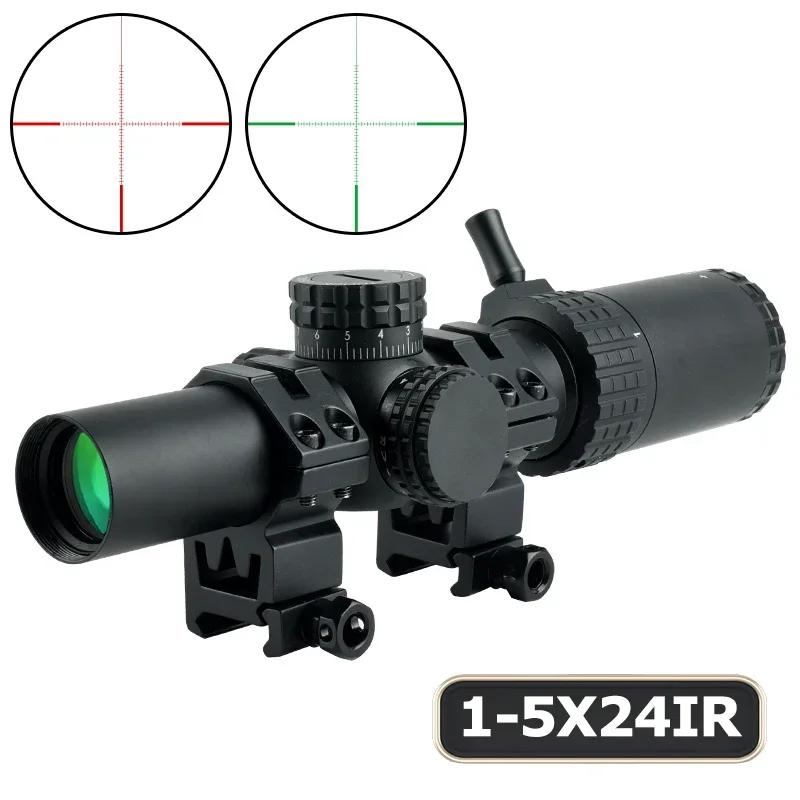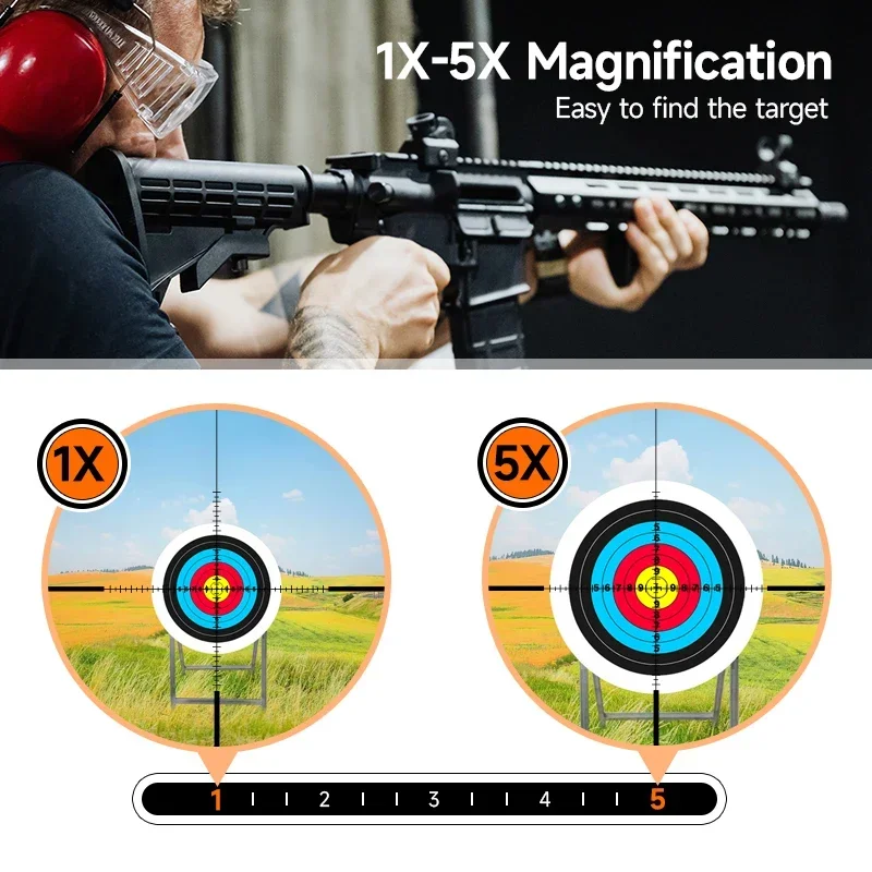 Mira de rifle táctica de alto rendimiento, con un aumento de 1-5x, capaz de disparar a un alcance cercano al medio de más de 300 yardas.