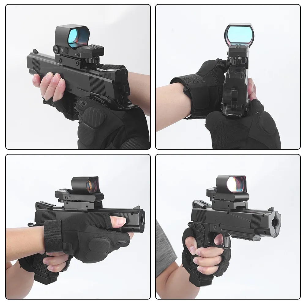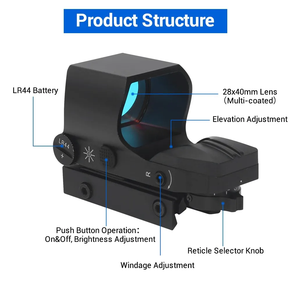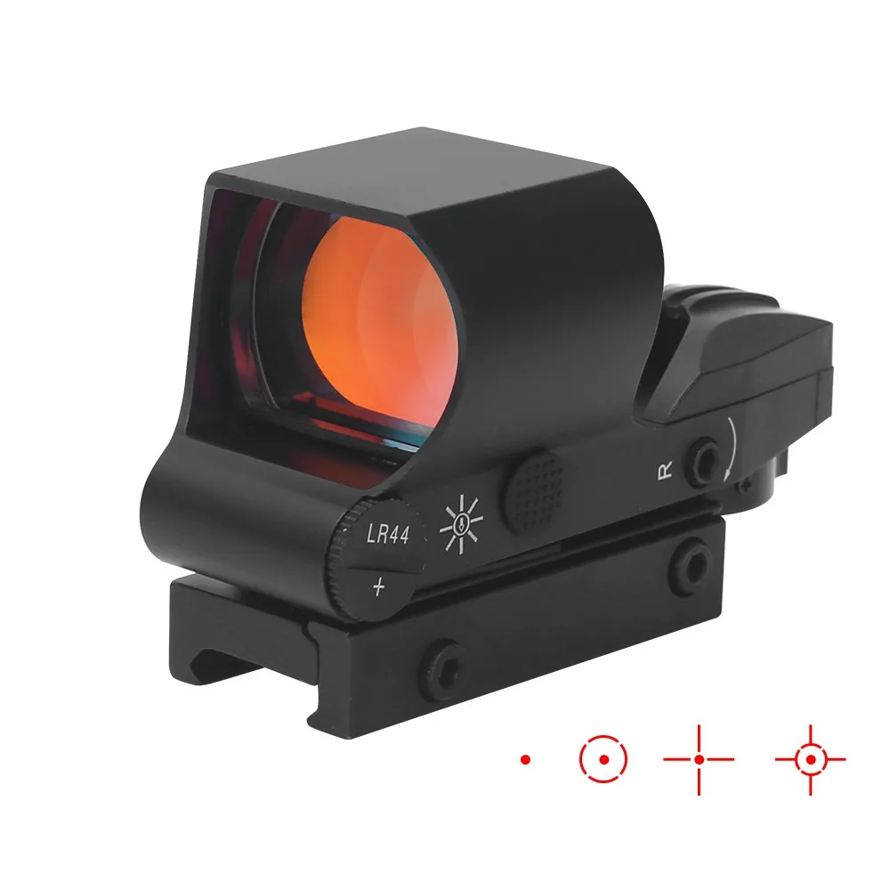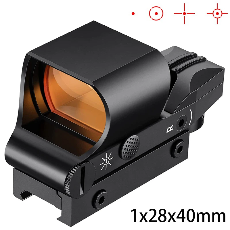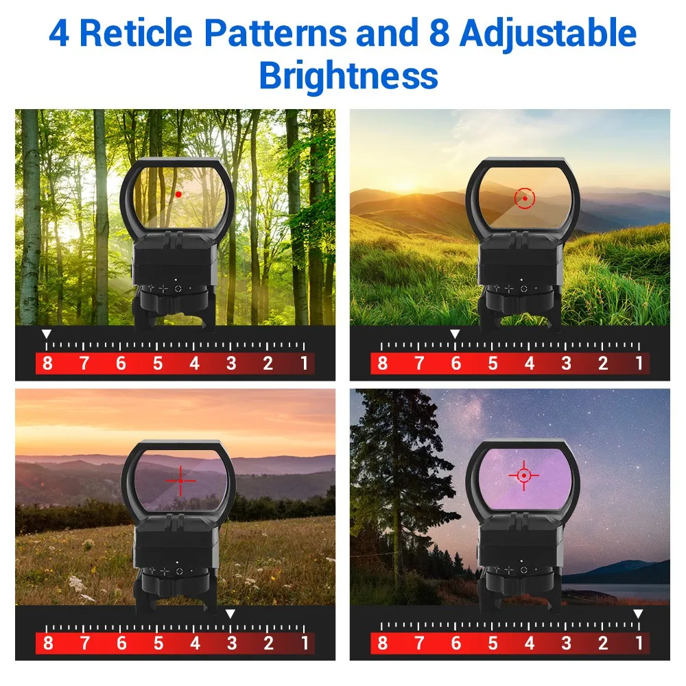 2.【4 opciones de retícula】 Las miras reflejas iluminadas con 4 selecciones de retícula brillantes brindan varias opciones para satisfacer diferentes ocasiones.Las combinaciones Red-Dot, Circle/Dot, Crosshair/Dot y Crosshair/Circle/Dot son todas en una sola mira, combina con sus miras metálicas existentes.