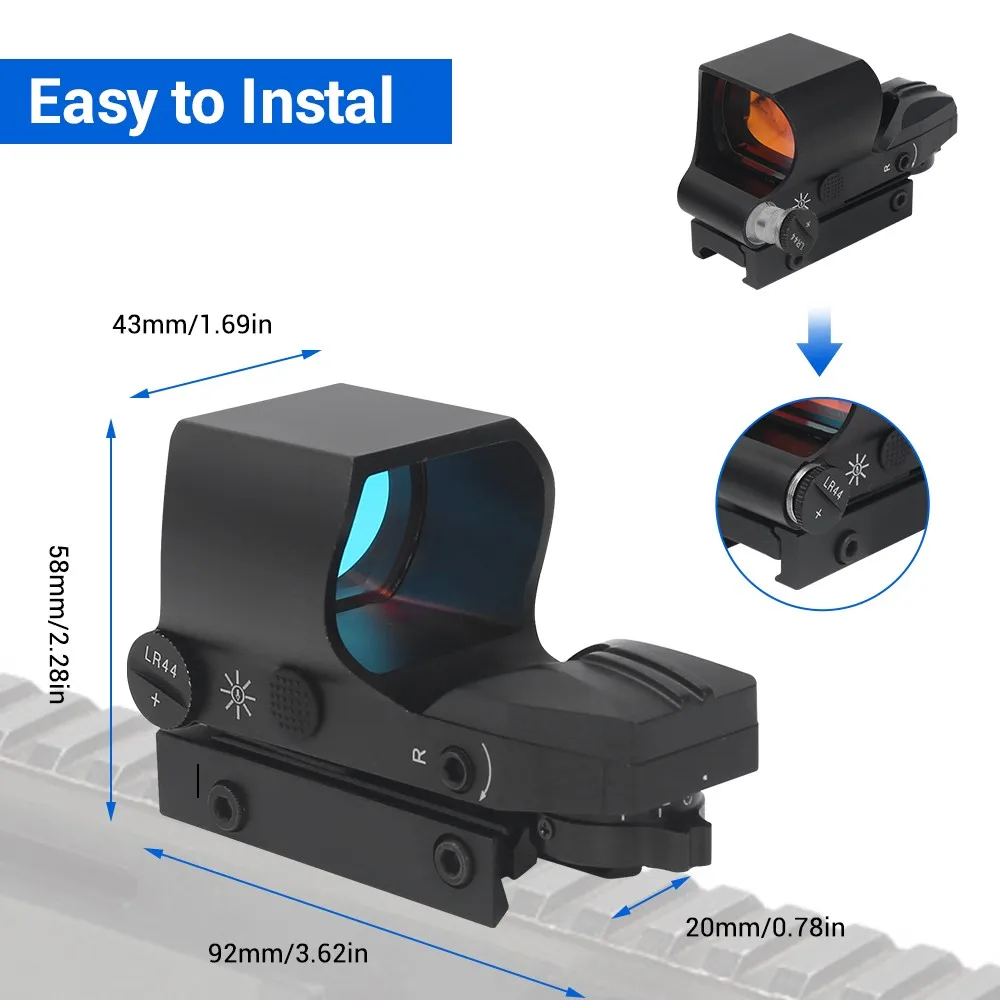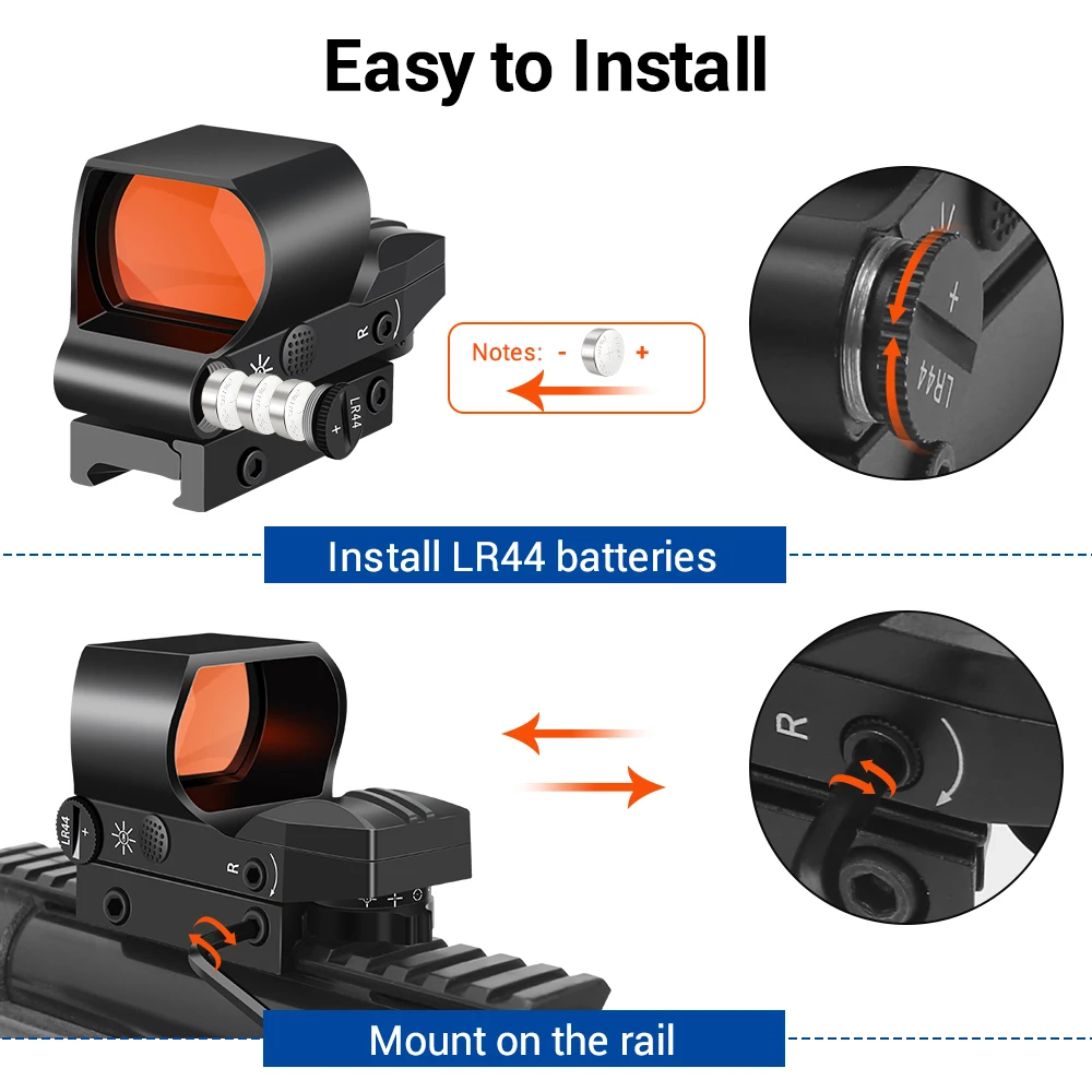 4. 【Fácil de instalar】 La mira de retícula con base de montaje estándar de 20 mm se instala cómodamente en el riel Picatinny, utilizando llaves Allen incluidas.El compartimento compacto de la batería facilita el reemplazo de la batería.