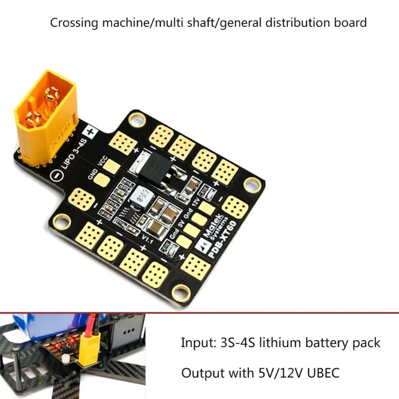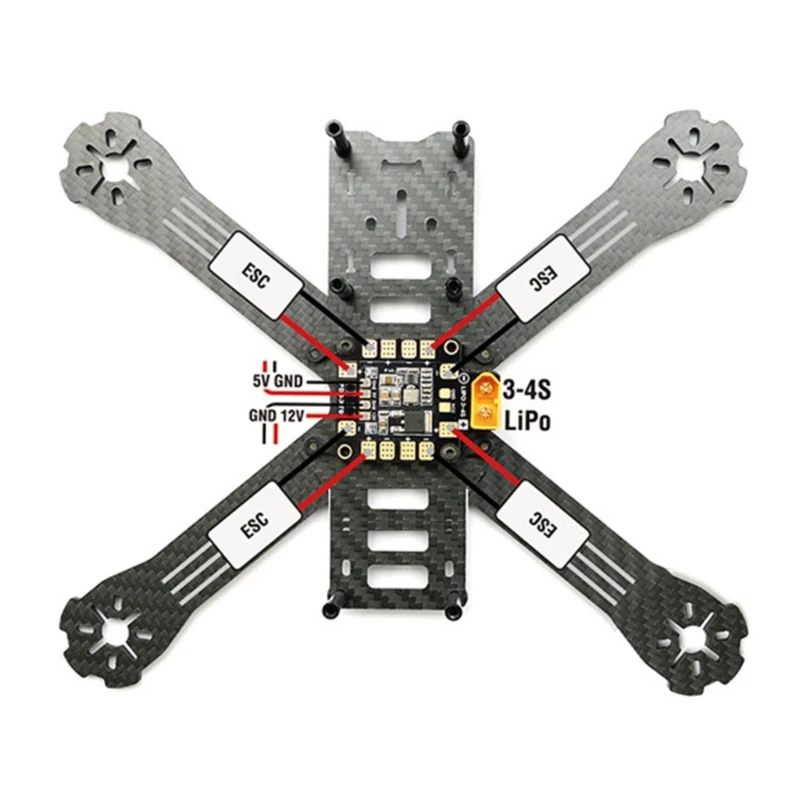 Distribuye la energía de un paquete LiPo a 6 ESCs, además de proporcionar salidas de CC sincronizadas y reguladas de 5V y CC lineal regulado de 12V para alimentar cámaras, servos, receptor RC, controladores de vuelo, transmisores de vídeo, LED, etc.