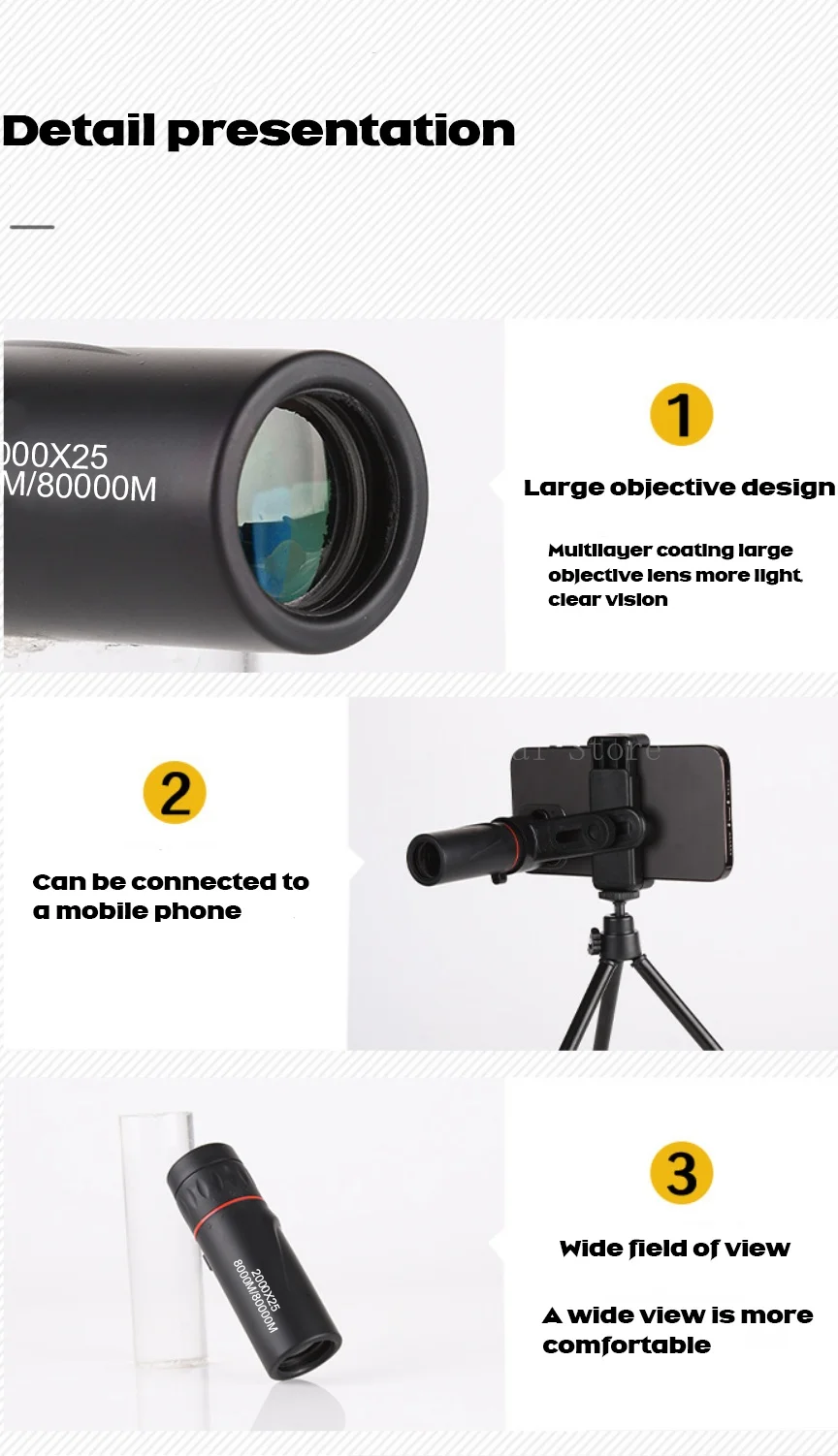 1 x telescopio 1 x Clip 1 x trípode 1 x bolsa 1 X Instrucciones 1 x cordón 1 x paño de limpieza
