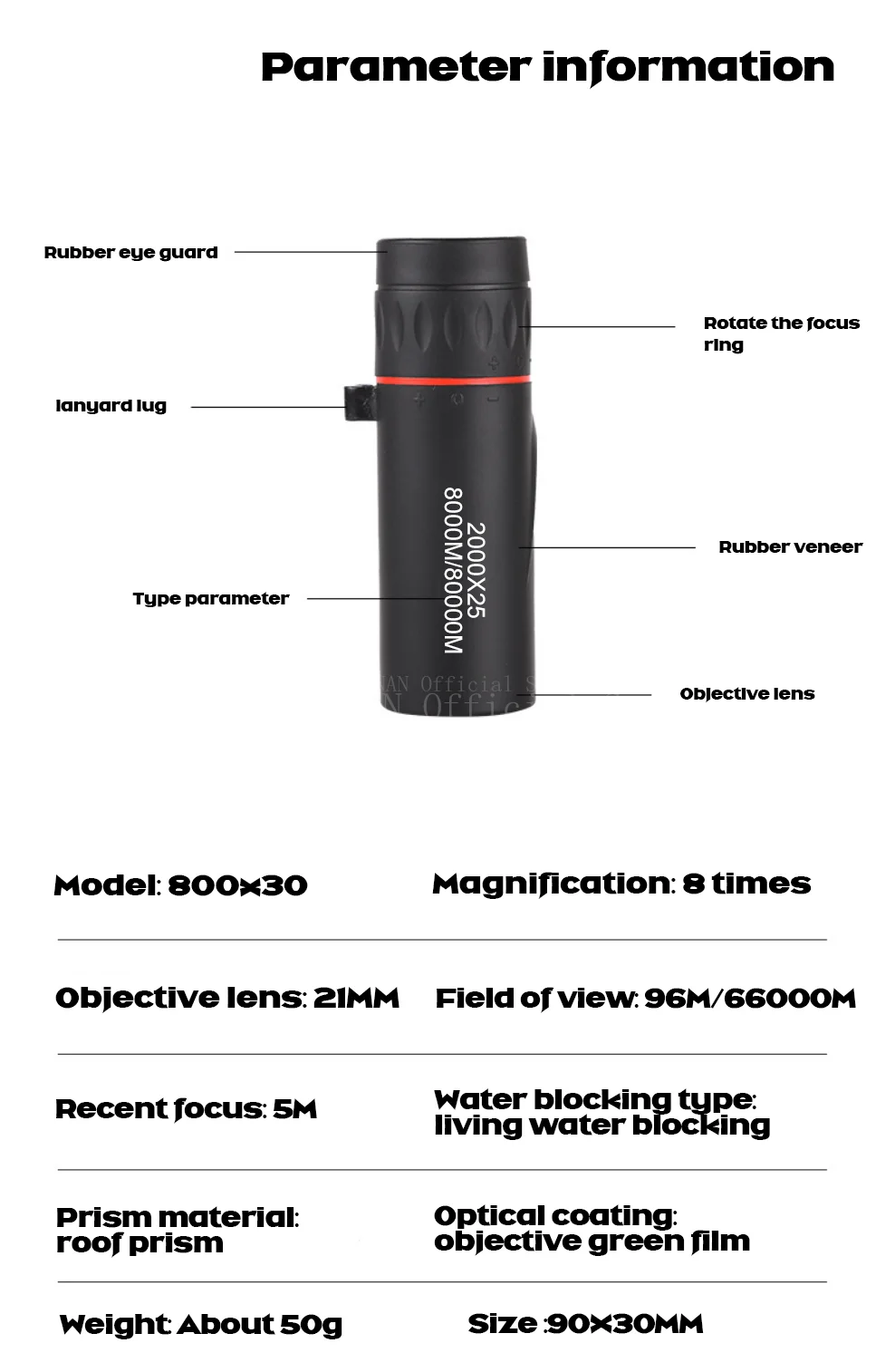 Material: plástico/metal Longitud 92x diámetro 30mm Tamaño: 9,2x3cm/3,62x1,18 pulgadas Tipo: Mini telescopio de alta definición. Relación: 8X Ángulo de campo: 7 ° Kilómetro de horizonte: 8000M/8000M Diámetro de la pupila de salida: 3,6mm Distancia de la pupila de salida: 9mm Distancia de enfoque Última: 5M Sistema de prisma: sistema de prisma BAK4 Lente: una lente óptica Función: impermeable