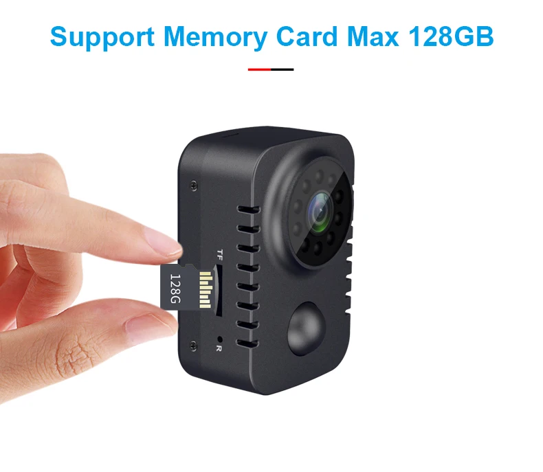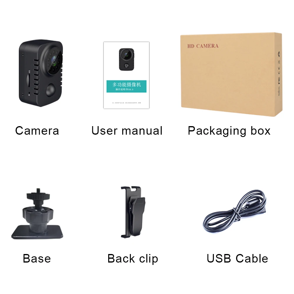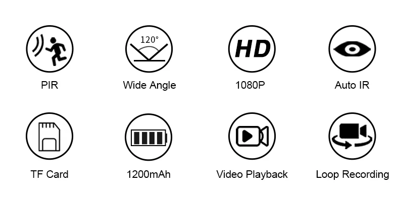 Función: Relación de Resolución de vídeo: 1920*1080P Con soporte automático para vídeo, PIR, apagado de vídeo, cobertura cíclica, vídeo síncrono y tiempo de revisión de carga. Velocidad de fotogramas: 30FPS Batería: 1200mAh, tiempo de vídeo: 8H compatible con tarjeta TF de 4-128G