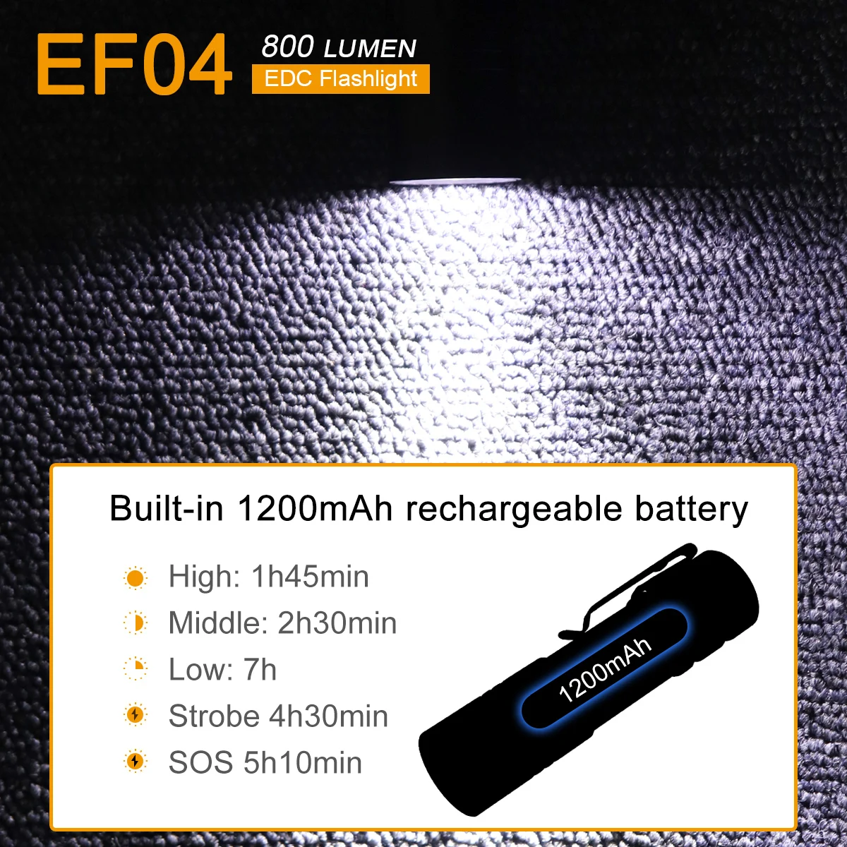 Haz brillante y constante: - Potentes cuentas de lámpara L2, linterna EDC recargable de 800 lúmenes. - Tiene un alcance máximo de 200 m. - Temperatura de color 7000-8000 K, fuente de luz fría, efecto de luz diurna, alta eficiencia luminosa.