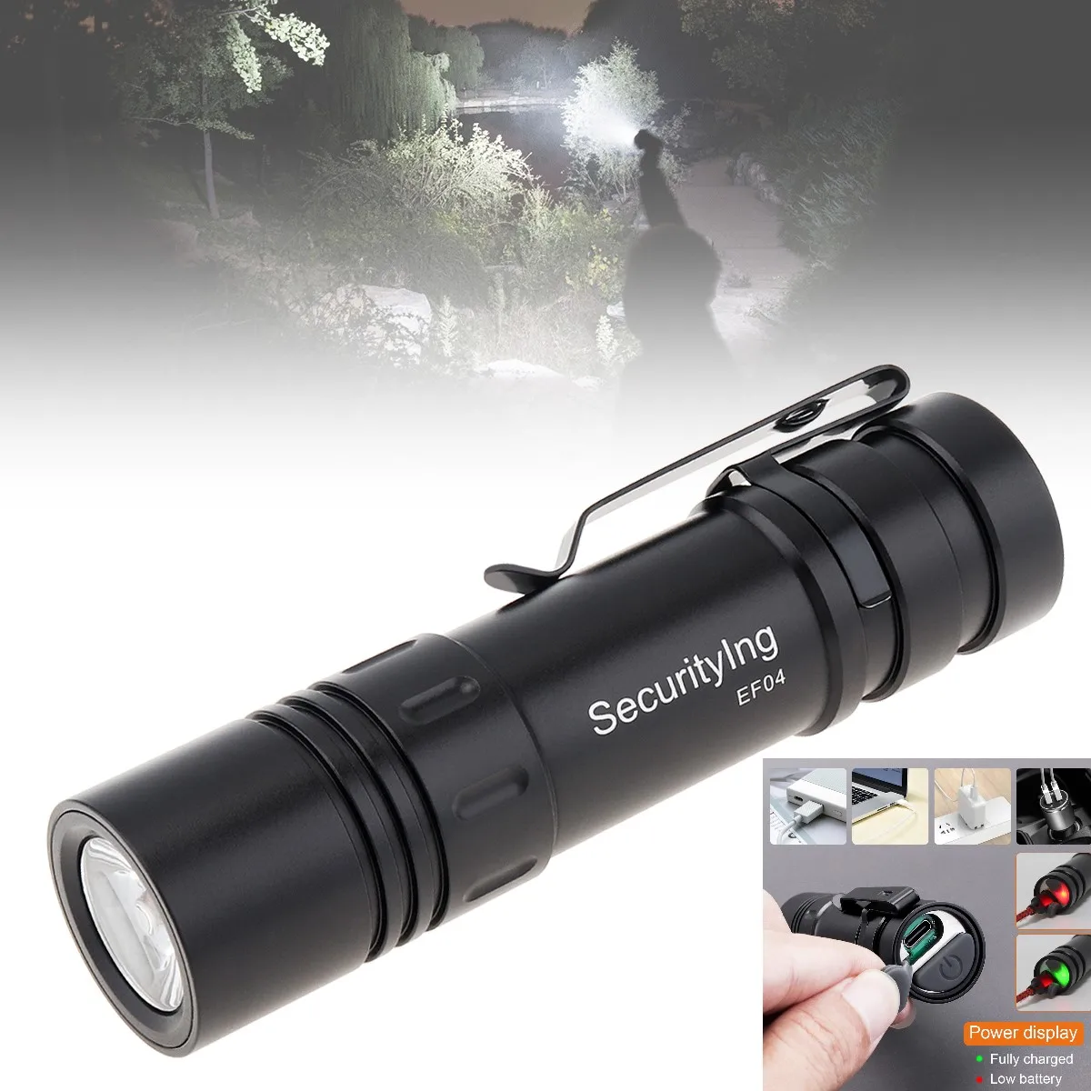 5 modos y fácil de usar: - Alto/medio/bajo/estroboscópico /SOS.- Presione el interruptor trasero con la mano para ajustar el modo de luz libremente.- La linterna tiene una función de memoria de engranajes que le permite activar los modos de iluminación comunes.- Tamaño compacto, sólo 92 g.- Con clip fijo, fácil de transportar y fijar.