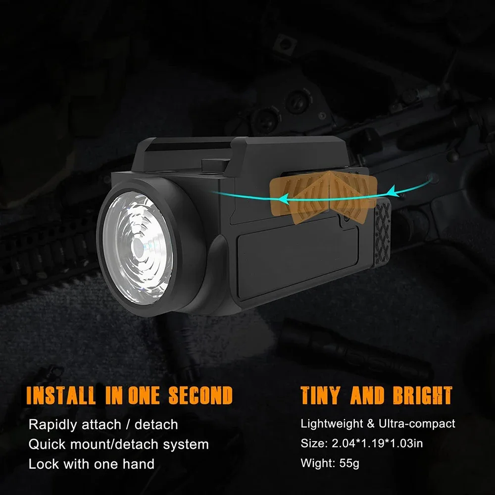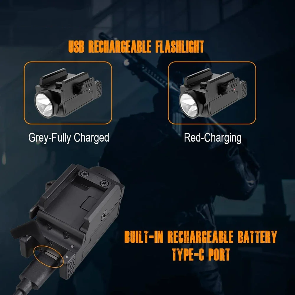 Mini pistola de 800 lúmenes, luz LED táctica para arma, USB recargable por luz compacta, linterna de pistola de liberación rápida para riel 1913 o GL