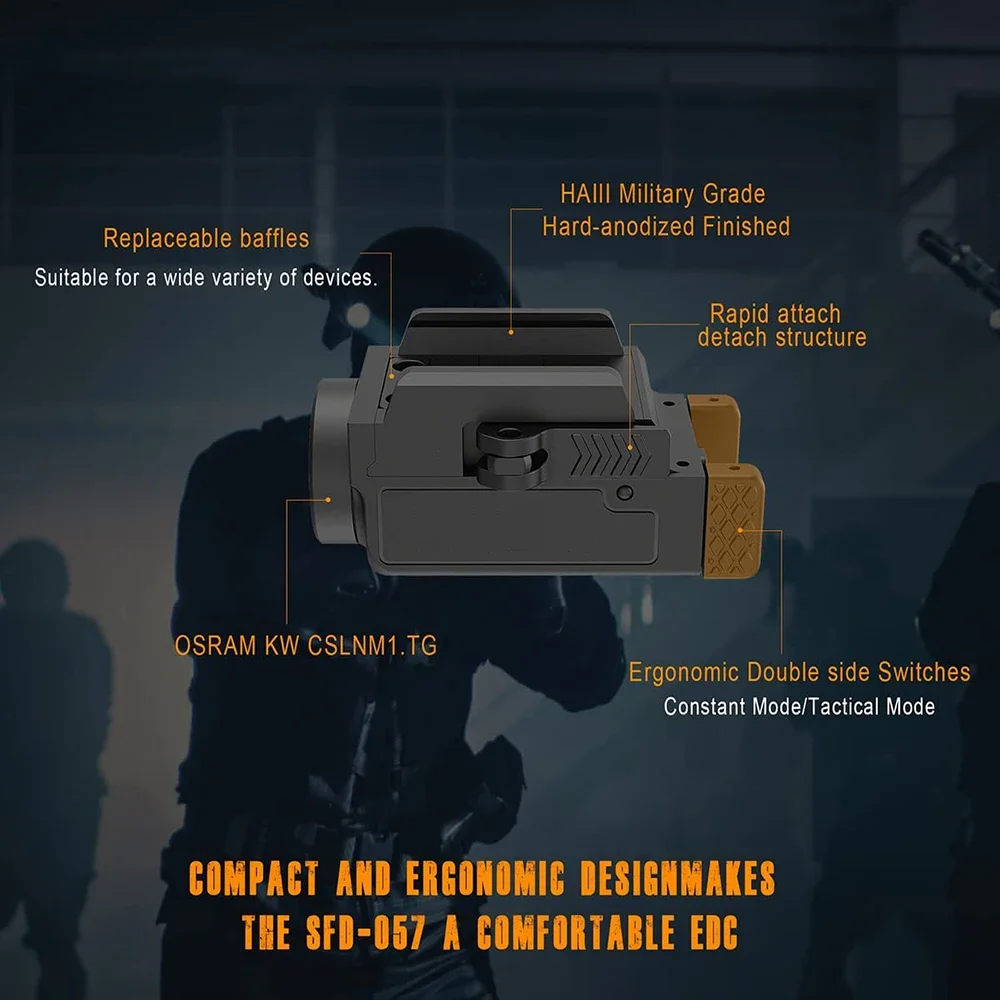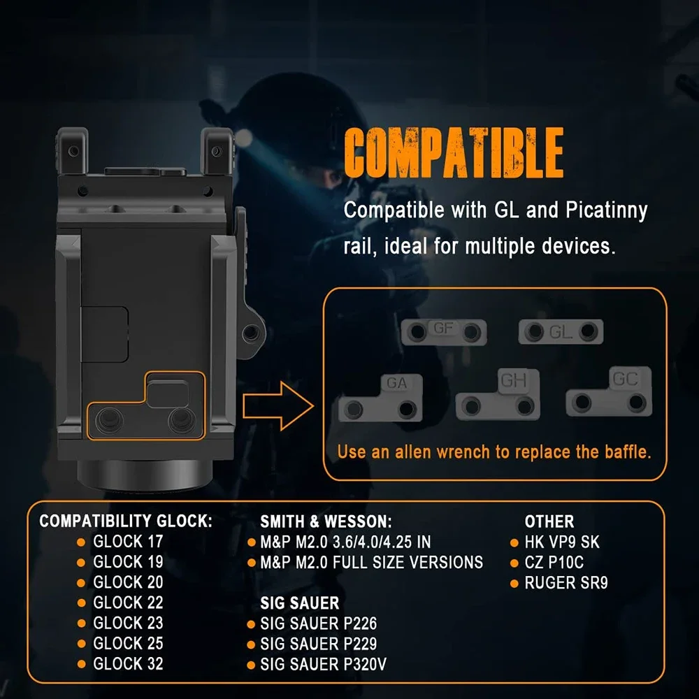 Interruptores ergonómicos de doble cara para iluminar su visión fácilmente, cualquiera de las manos puede activar los accesorios de la pistola. Con diseño de modo dual electrónico, modo de bloqueo táctico (función de encendido instantáneo) y modo de uso diario (permanecer encendido).