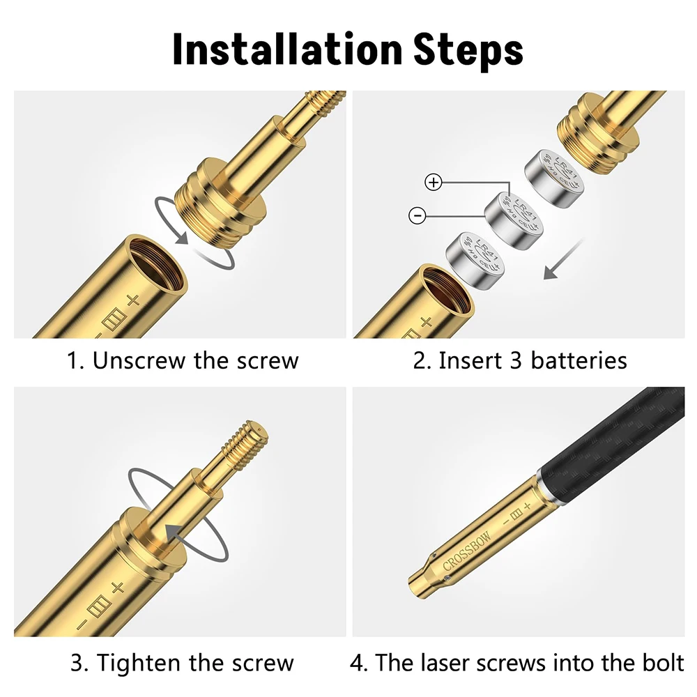 Inserte 3 pilas, apriete el tornillo y el láser rojo brillante se activa automáticamente. Gírelo en el extremo del perno, colóquelo en la ballesta y comience la alineación. No hay interruptor de apagado, Retire las baterías cuando termine de usar la mira láser de ballesta.