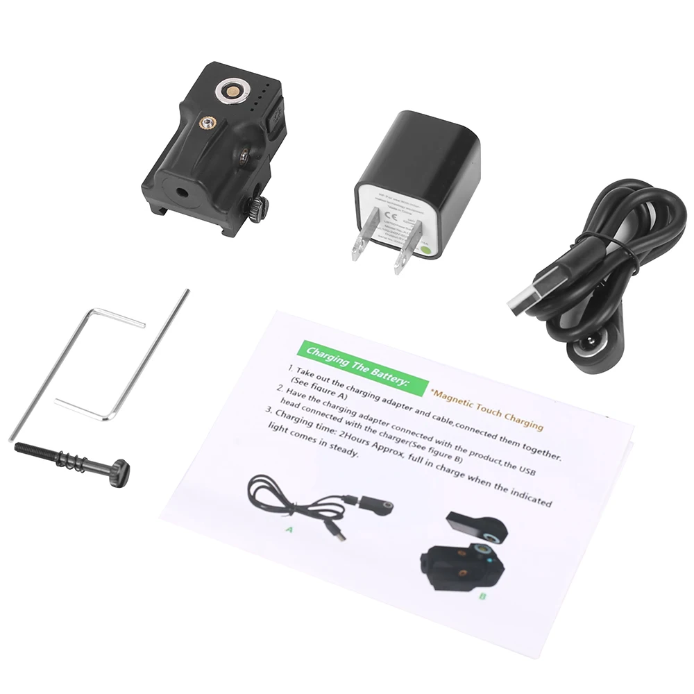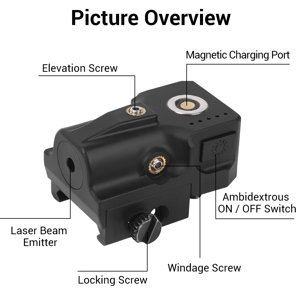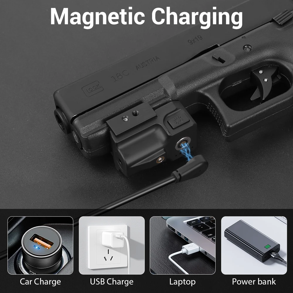 3.【Función de carga USB magnética incorporada】Simplemente conecte el cable de carga USB incluido al puerto de carga, no requiere desmontaje, es fácil y seguro.Ideal para cargar en tu pistola.Solo se necesitan 90 minutos para cargarse completamente y el láser brillante proporciona 4 horas de funcionamiento.