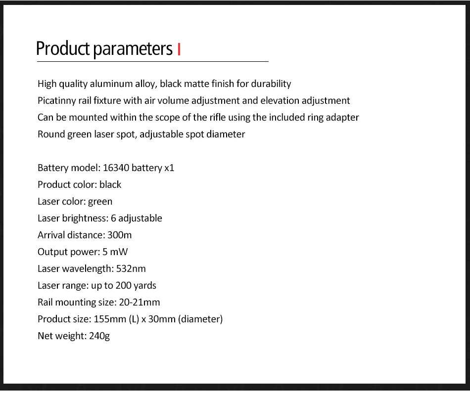 Característica: Aleación de aluminio de alta calidad con acabado negro mate duradero. Montaje en carril Picatinny con ajuste de deriva y elevación. Se puede montar en el visor del rifle con adaptador de anillo suministrado. Punto láser verde redondo y diámetro de punto ajustable. Especificación: 1. Longitud de onda del láser: 532 nm 2. Potencia de salida: 5 mW 3. Zoom láser: ajustable 4. Rango del láser: hasta 200 yardas 5. Potencia: 1 batería de iones de litio DC3-3.7 V, CR123A/16340. (Excluido) 6.Material de la carcasa: Aleación de aluminio 7.Tamaño del montaje en riel: 20-21 mm 8.Tamaño del producto: 155 mm (largo) x 30 mm (diámetro). 9. Peso neto: 210 g Lista de paquetes: 1 diseño láser verde; 1 anillo de alcance de 30 mm; 1x interruptor de línea trasera; 1x llave de velcro; 1x instrucciones de usuario