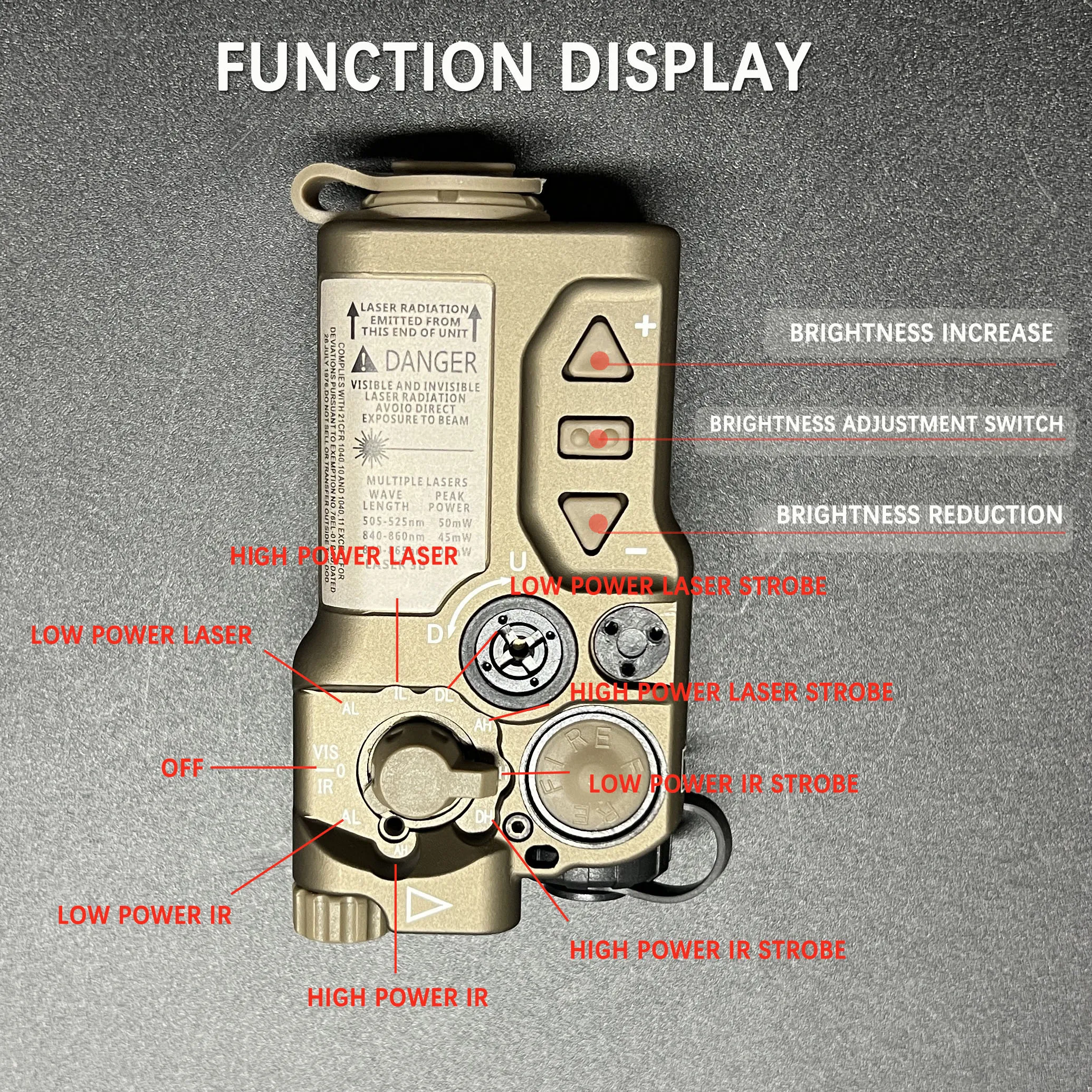 CARACTERÍSTICAS:Láser encendido constante, encendido momentáneo, estroboscópico láser, encendido constante del láser IR, encendido momentáneo del láser IR, estroboscópico del láser IR