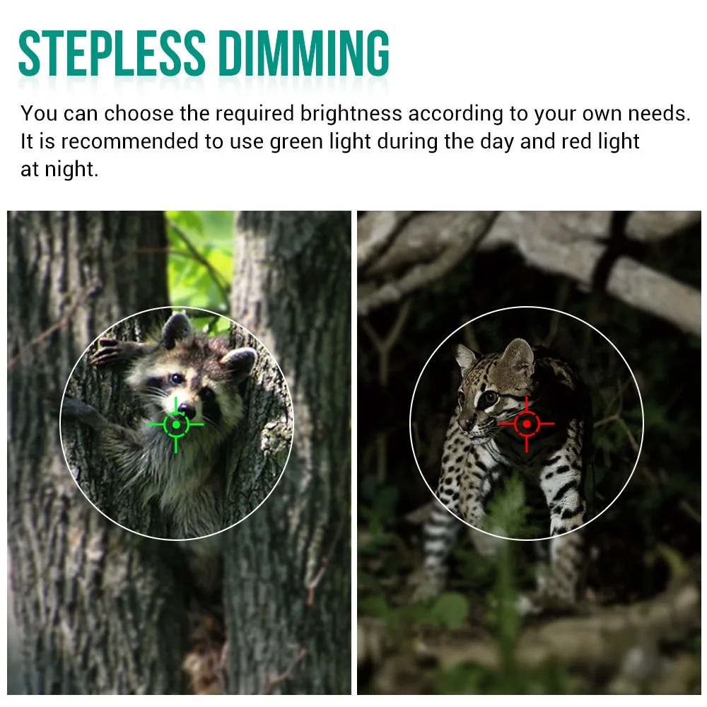 2. 【Iluminación roja y verde】 Con opciones de iluminación de retícula roja y verde, esta óptica garantiza una visibilidad óptima en diversas condiciones de iluminación, lo que le permite adaptarse a entornos cambiantes y mantener una imagen clara.