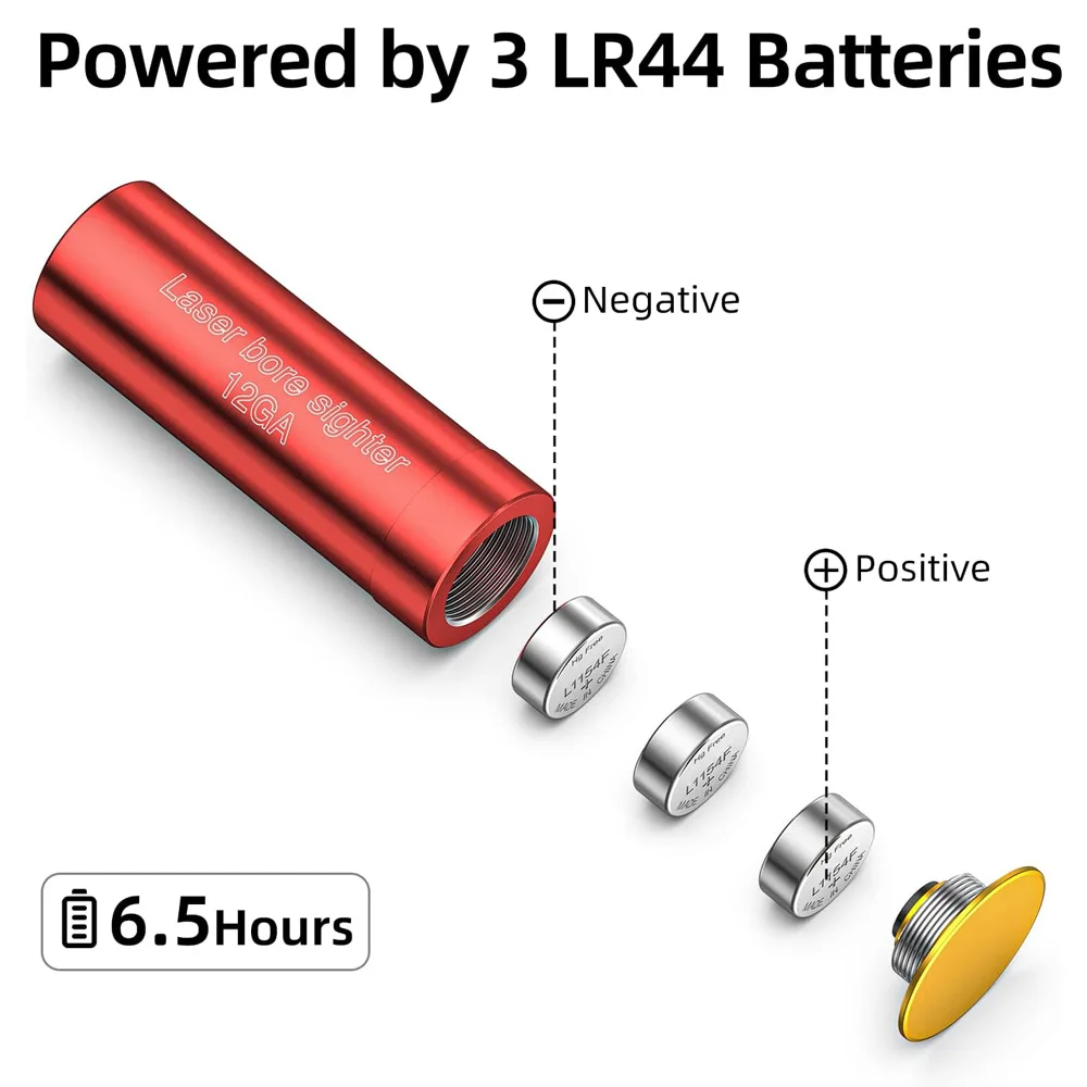 【Boresighter de larga duración】 La mira de diámetro de calibre 12 utiliza 3 baterías a la vez.El LR44 actualizado durará hasta 6,5 horas por juego.