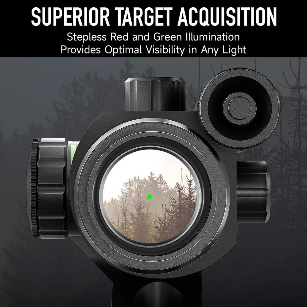 Cambie entre retículas de punto rojo o verde con 5 niveles de brillo.Optimice la visibilidad en cualquier condición: rojo para entornos de poca luz y verde para uso diurno.