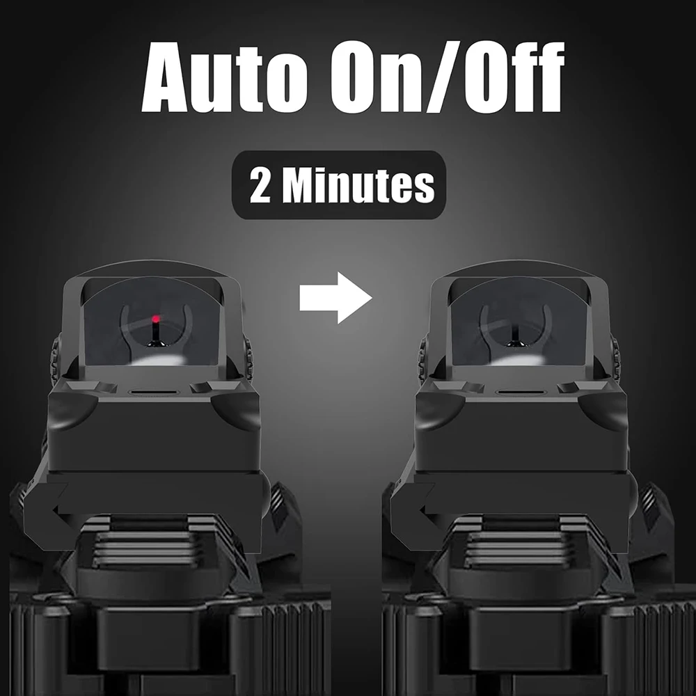 【Función de acertar】Se apaga automáticamente después de 2 minutos de inatividad.Cualquier ligero sacudido se reiniciará.La función de memoria restaurará el punto rojo a su brillo antes de apagarlo. Duración de la batería de hasta 20000 horas.(Con el brillo más bajo)