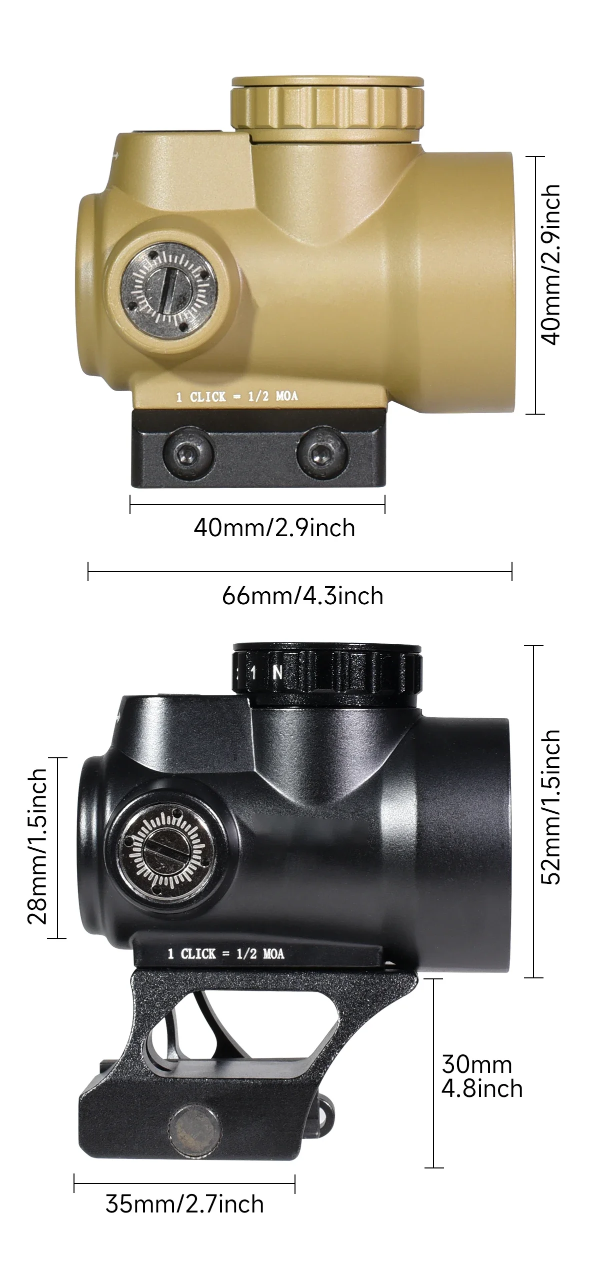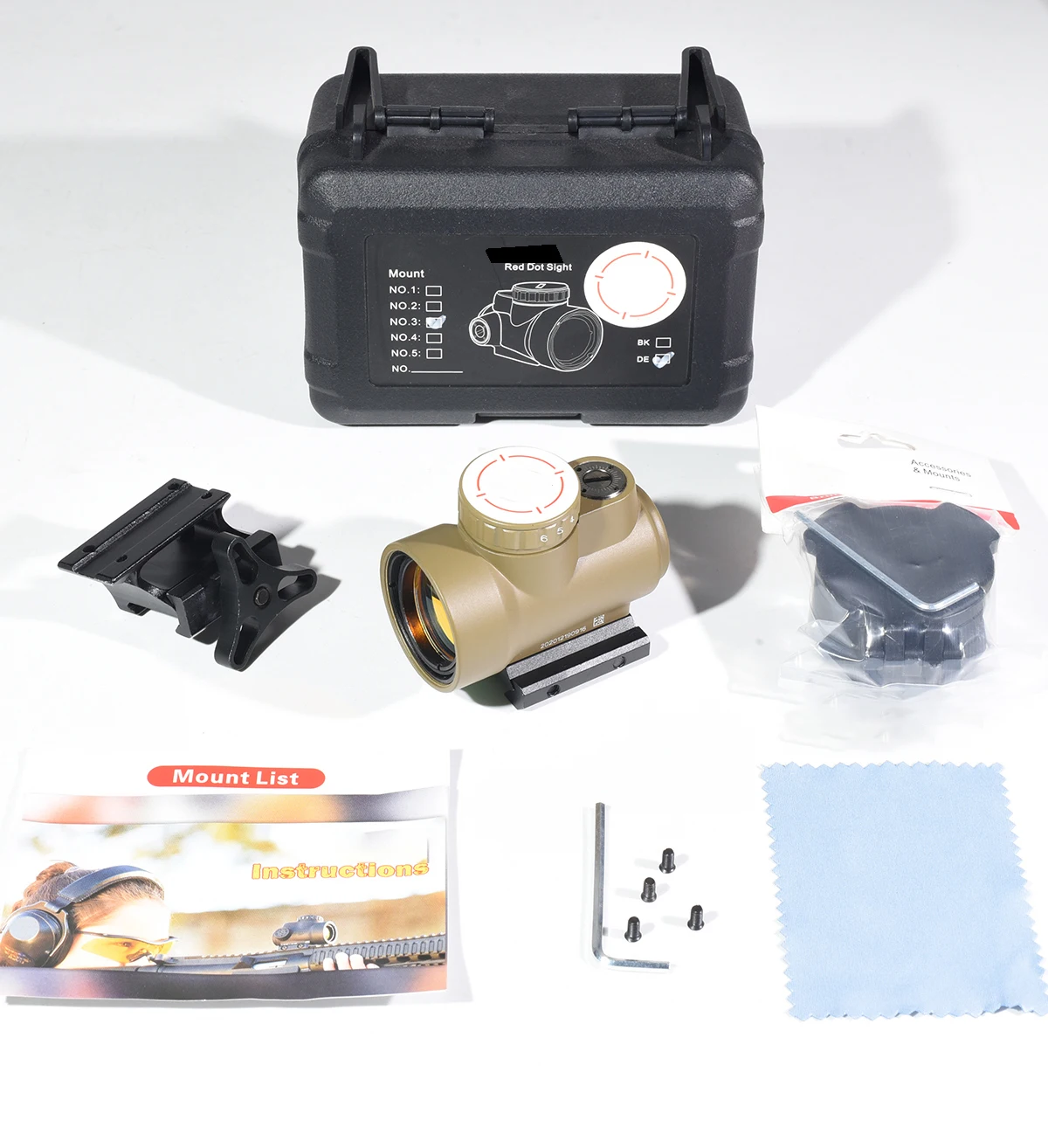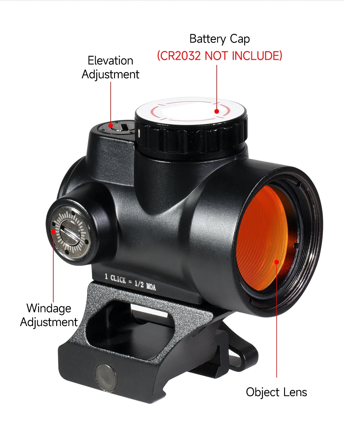 Especificaciones·Ampliación: 1x.Tamaño del objetivo (mm): 25 mm.Fuente de iluminación: batería.Patrón de carícula: PUNTO holográfico.Day Reticle Color:Rojo·Alivio ocular (en): InfinitoAjuste a 100 yardas (clices/in): 1 clic=1/2 MOA·Material de la carcasa: aluminio forjado 7075-T6.Baterías: 1 batería de litio CR2032 (no incluida).Rango de ajuste: 70 MOA Recorrido total