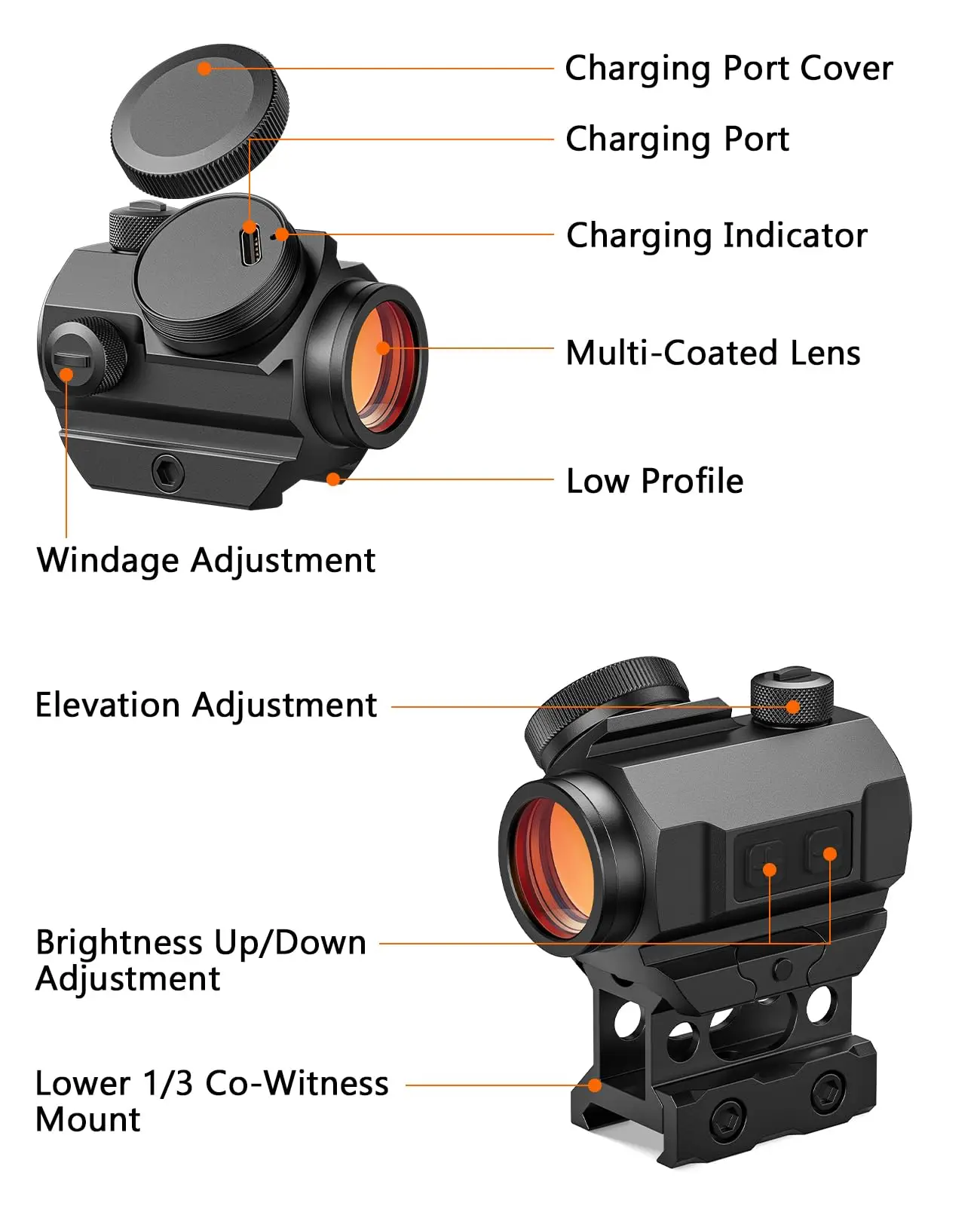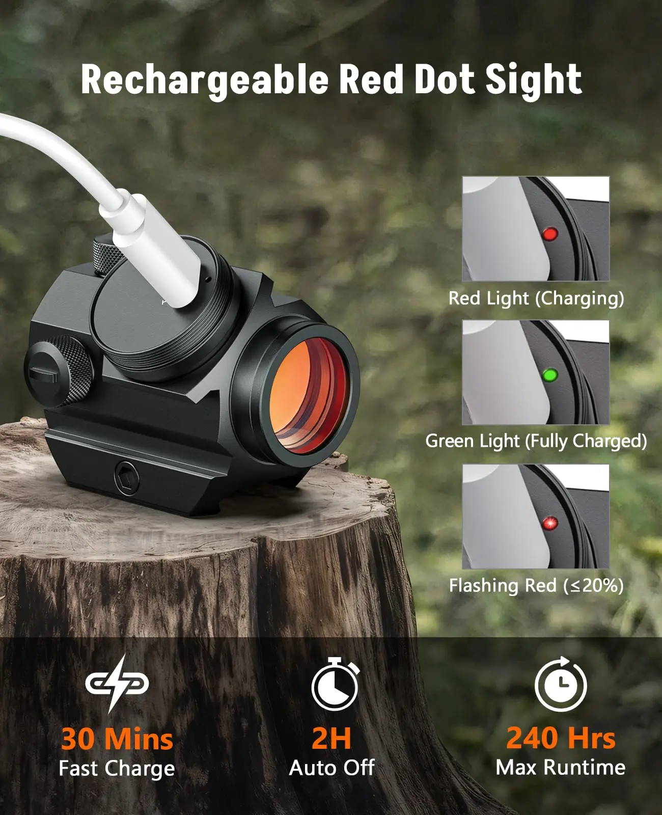 【Óptica de punto rojo recargable】 Esta mira refleja cuenta con un puerto de carga para una carga conveniente desde varias fuentes de energía, eliminando la necesidad de reemplazar las baterías, y esta característica la diferencia de otras miras y ópticas de punto rojo en el mercado.【Carga rápida y modo de espera prolongado】 Disfrute de capacidades de carga rápida y un tiempo de espera prolongado con estos visores de punto rojo, que brindan una carga completa rápida en solo 30 minutos para hasta 240 horas de uso.El paquete incluye un cable de carga.