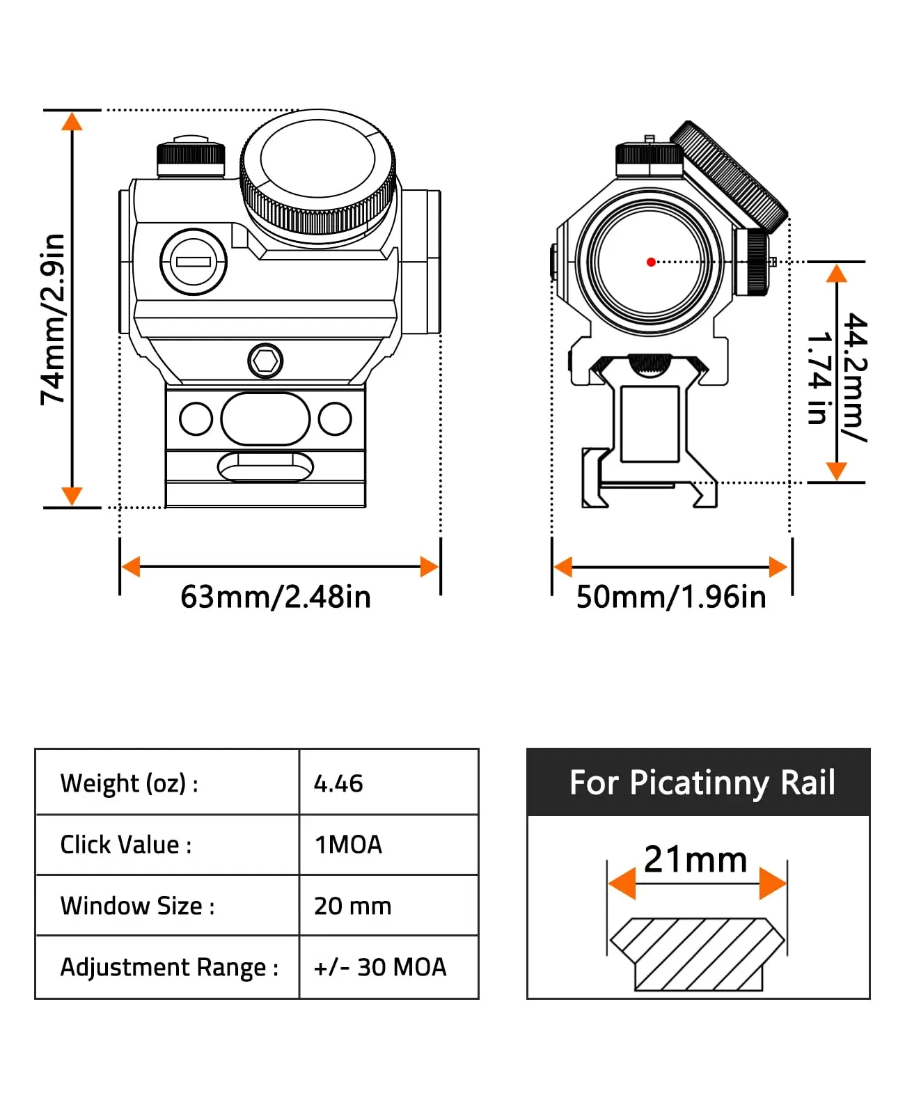 【Montaje elevador de 1'' y coestimiento inferior de 1/3】Al utilizar el soporte elevador de 1'' con mira de punto rojo MidTen, los usuarios logran un perfil de coestimiento de 1/3 más bajo.Además, los usuarios tienen la opción de una configuración de altura más baja si se prefieren. 【Vista de punto rojo para Picatinny】 Compatible con rieles Picatinny estándar de 20 mm, garantiza soluciones de montaje fáciles y seguras.Se puede poner a cero fácilmente con ajustes precisos de deriva y elevación a 1 MOA por clic y mantener cero bien.