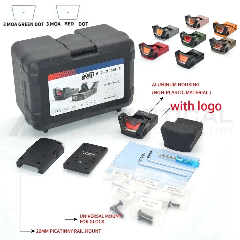 Mira de punto táctil M1 verde/rojo 3MOA con marcas originales completas, óptica Airsoft con riel de 20mm y placa de montaje Glock Universal