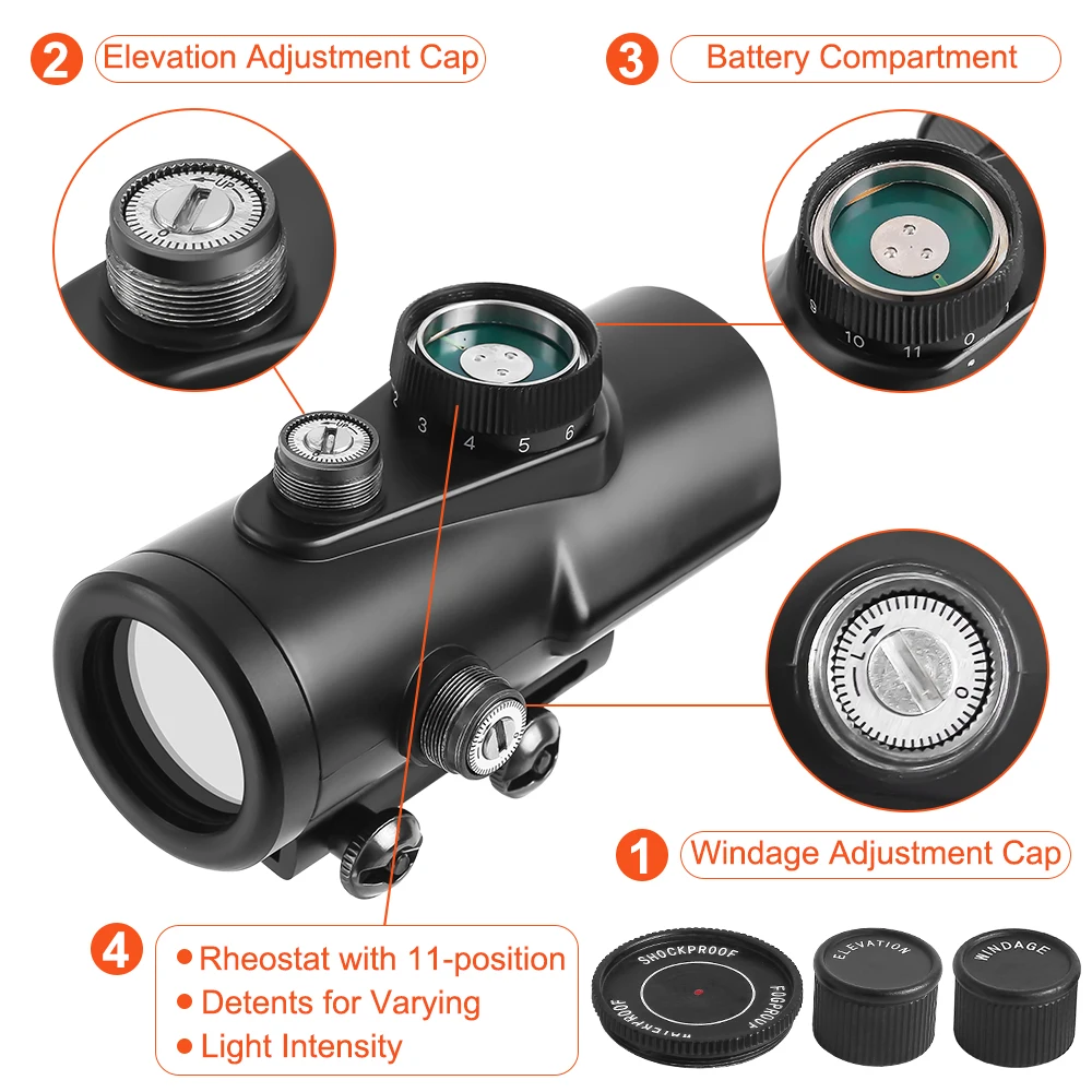 Está hecho de aleación de aluminio, las miras de airsoft son duraderas y livianas, impermeables y a prueba de golpes.Bajo consumo de energía para una larga duración de la batería.La cubierta antipolvo de goma ofrece una mejor protección.