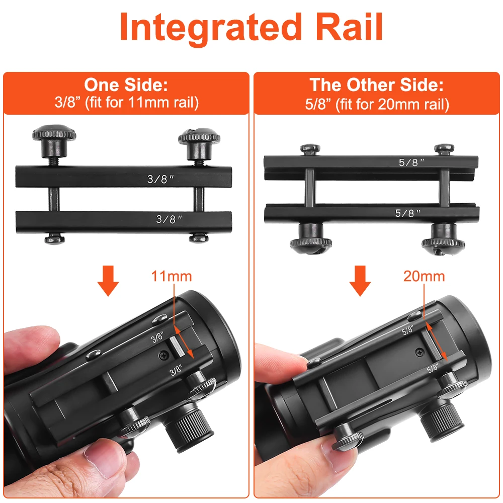 El visor de punto rojo tiene 11 mm y 20 mm (3/8" y 5/8") de montaje de riel desmontable o picatinny. Dos modos para conectar y ajustes de elevación y deriva de precisión cuentan con soporte de liberación rápida.No es necesario volver a cero al controlar la mira desmontada.