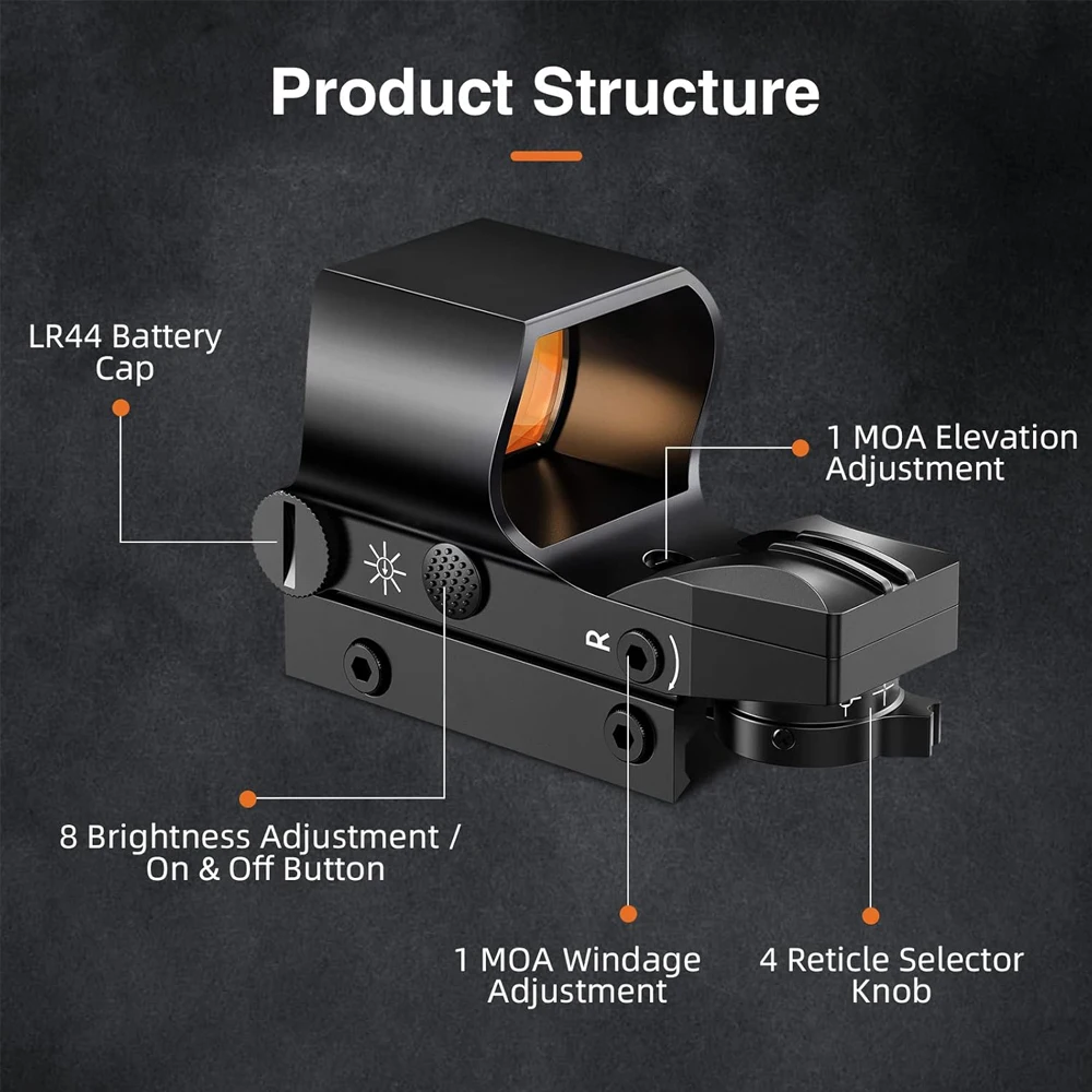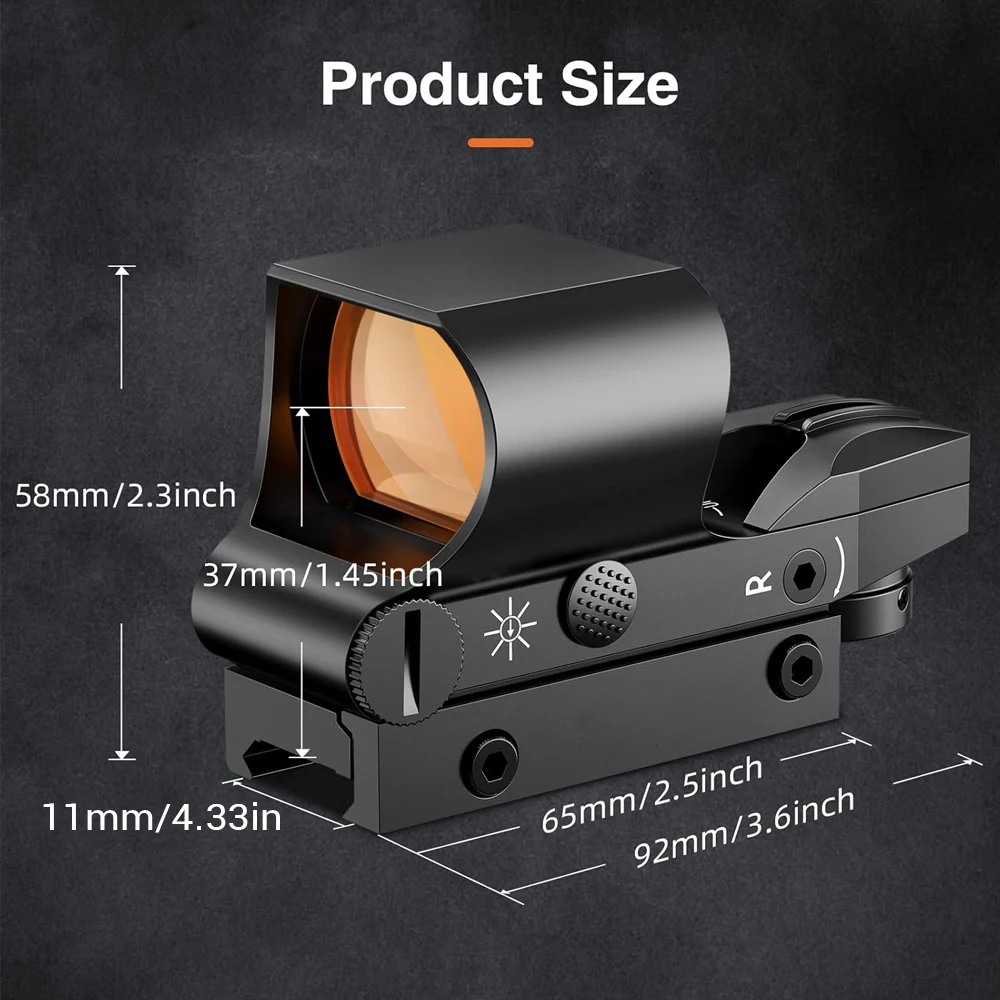 Las miras reflejas iluminadas con 4 selecciones de retículas brillantes brindan varias opciones para satisfacer diferentes ocasiones.Las combinaciones Red-Dot, Circle/Dot, Crosshair/Dot y Crosshair/Circle/Dot son todas en una sola vista, copropelerías