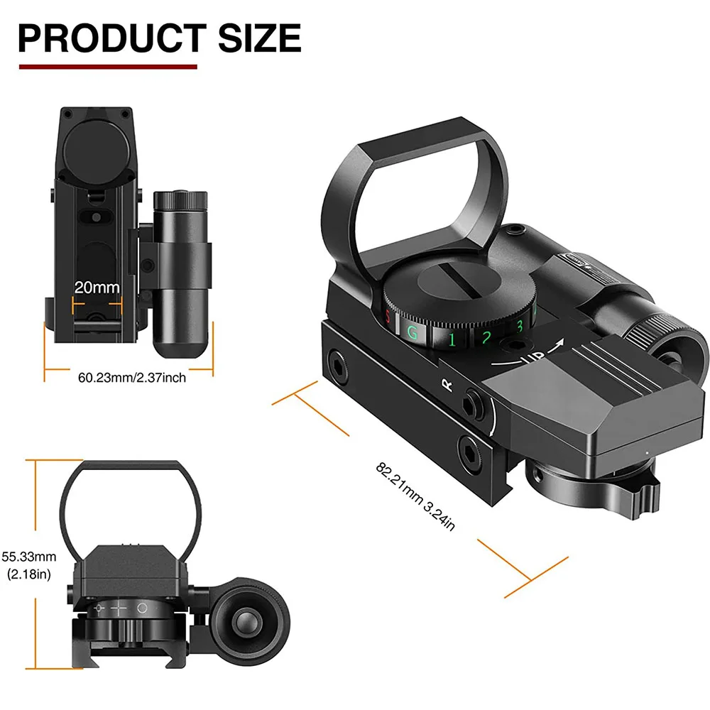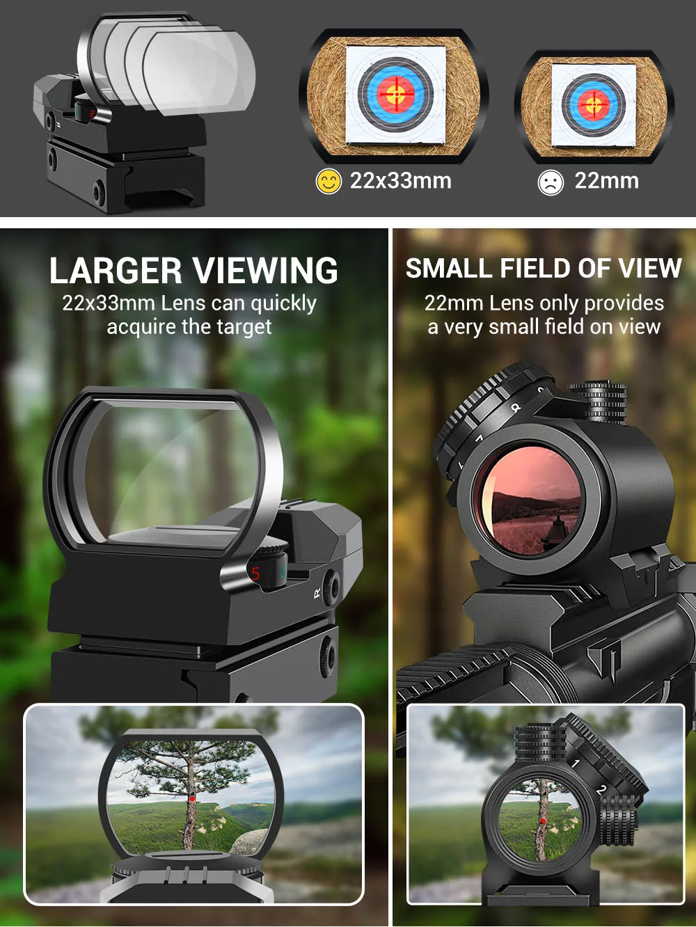 - La mira reflectante con lente totalmente multicapa de 22X33 mm proporciona un amplio campo de visión para una rápida adquisición de objetivos.