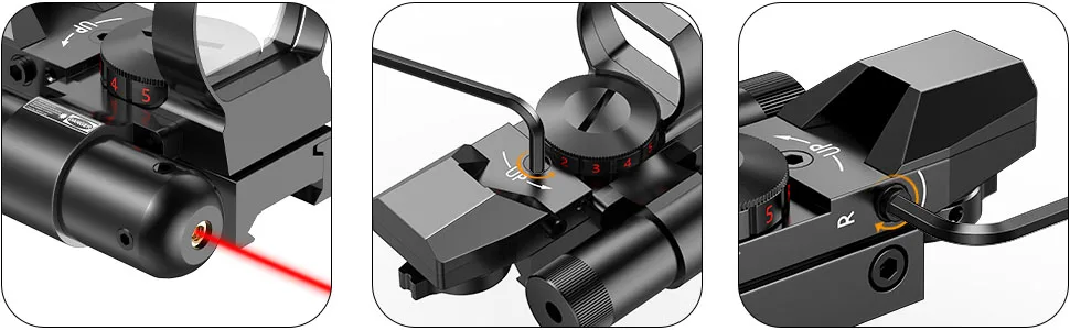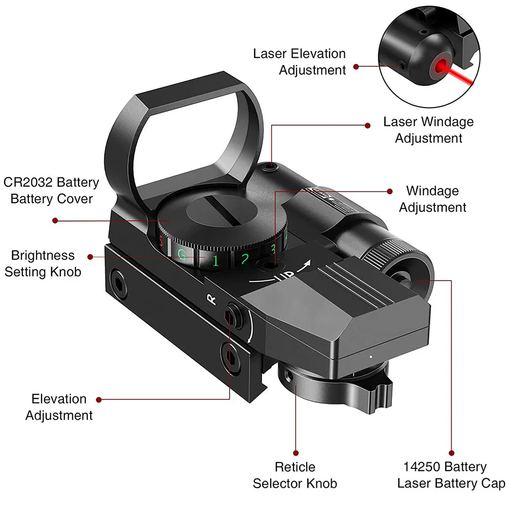 - La mira de punto rojo con 4 formas de retícula (Starburst, Cross, Bulleye, Dot) y 5 configuraciones de brillo, ofrece varias opciones en diferentes ocasiones, como un día soleado o nublado.