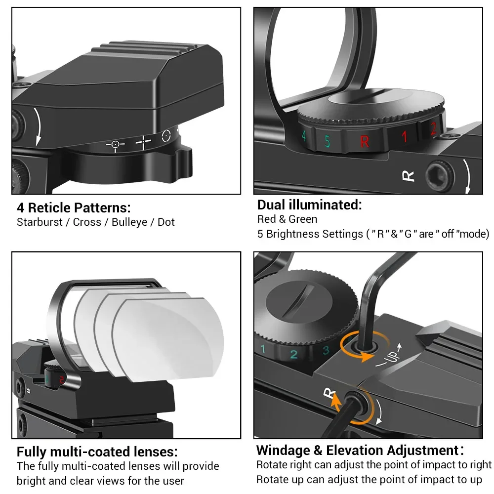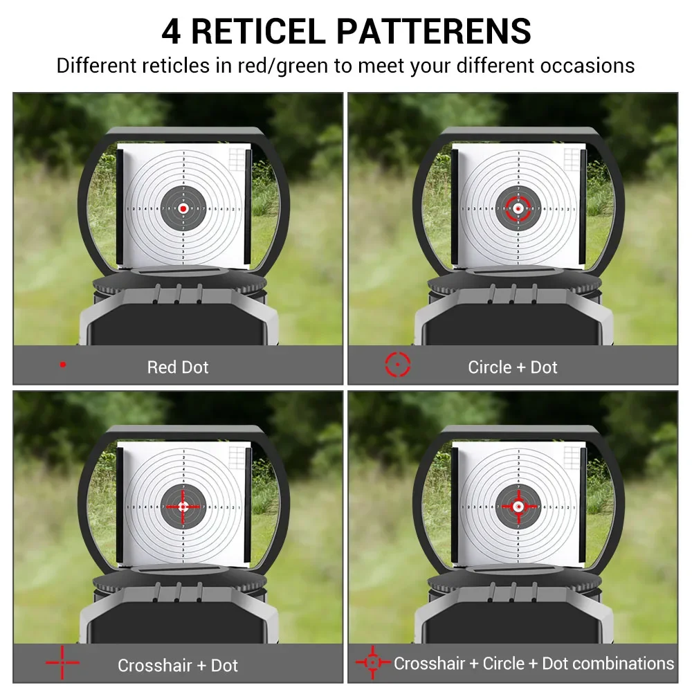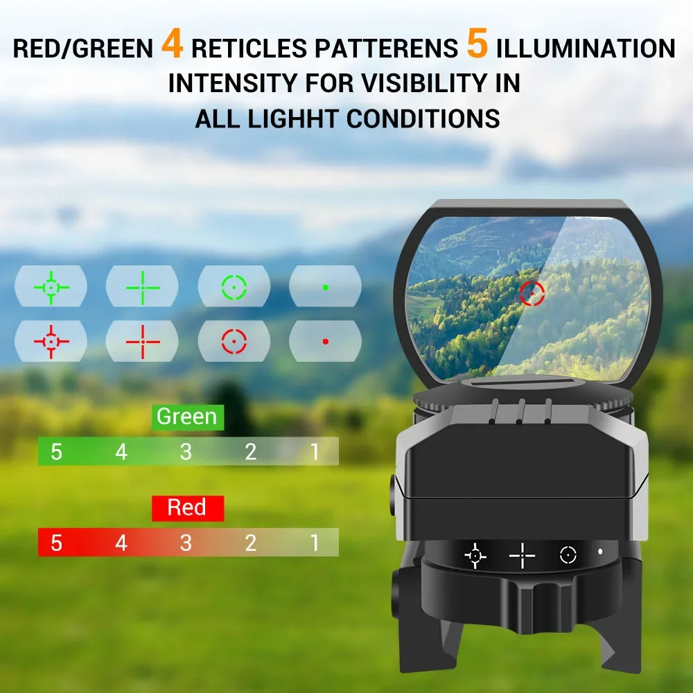 Con 4 patrones de retícula iluminados en rojo o verde, este visor reflejo ofrece un total de 8 opciones de observación diferentes y 5 niveles de brillo para alternar entre sí.