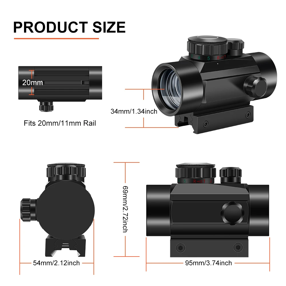 【Doble iluminación】La mira reflex se puede cambiar entre marcas de punto luminosas dobles rojas o verdes, con 5 niveles de ajuste de brillo.Para una mejor visibilidad, le recomendamos utilizar el rojo en un ambiente oscuro y el verde para el uso diurno.