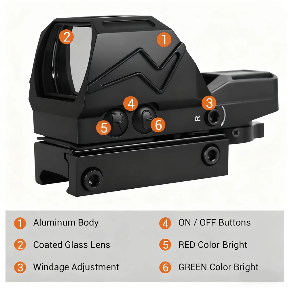 Mira de punto roja táctica, mira reflejada de punto rojo y verde, mira de rifle de 4 retículas para rieles Picatinny de 20mm, accesorio de pistola de caza