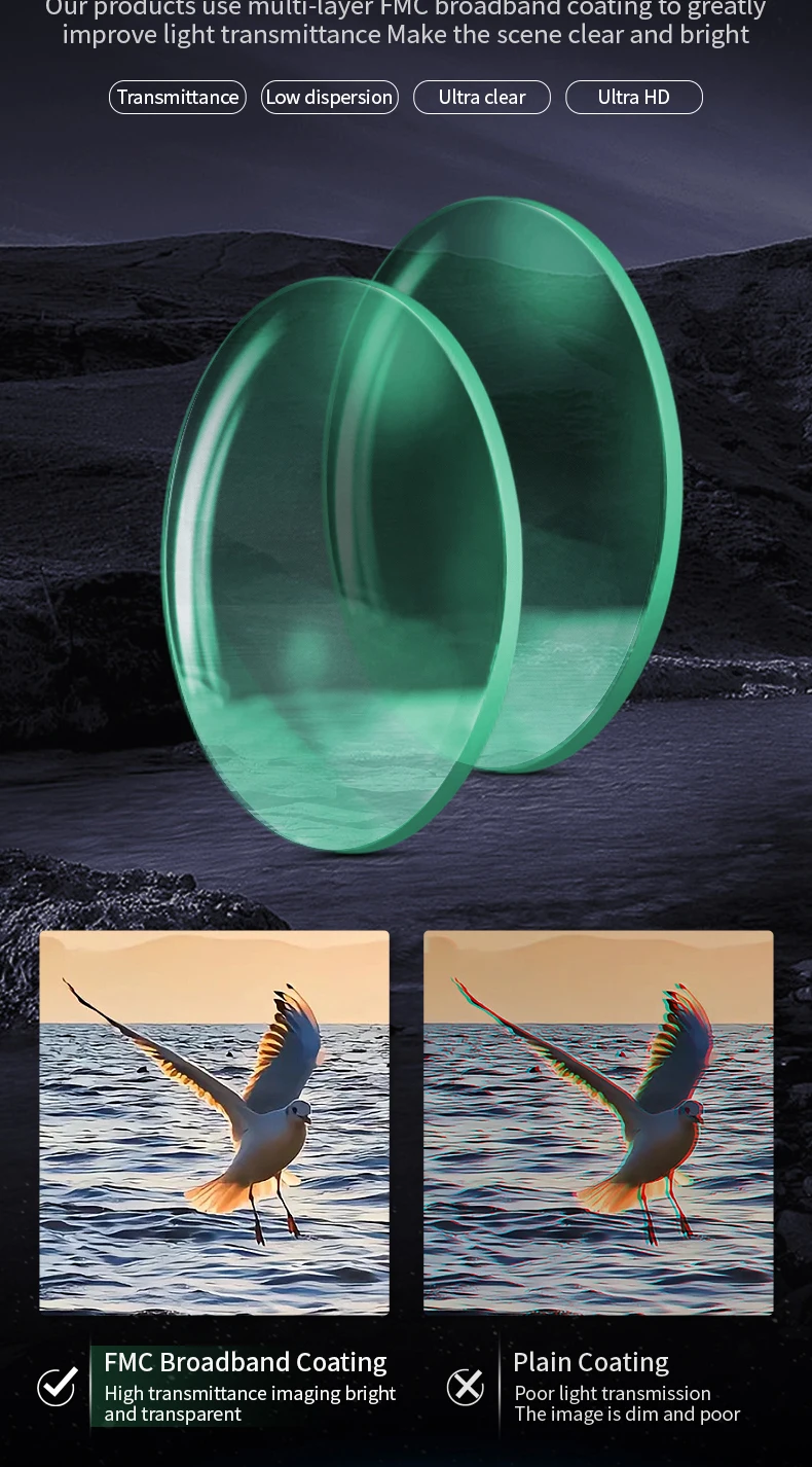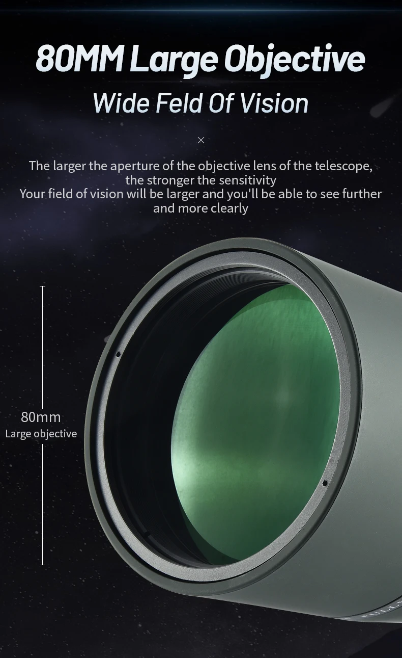 La lente objetivo de película verde de 80 mm totalmente multicapa proporciona un campo de visión de 82,9-48 pies/1000 yardas.La óptica de calidad del prisma Porro BAK4 aumenta la transmisión de luz y hace que su vista sea más brillante, clara y ofrece imágenes nítidas.