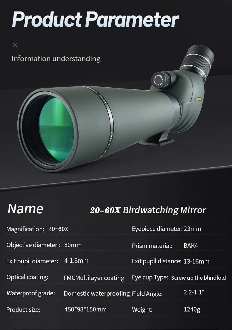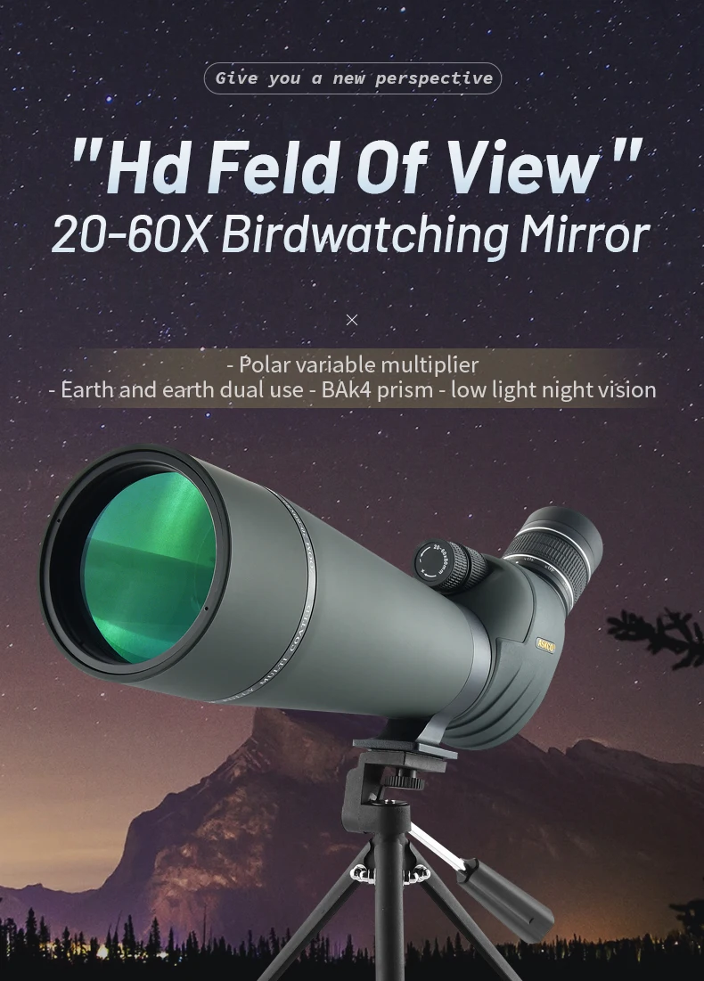 Ámbito de observación actualizado 20-60x80 con bolsa de transporte para trípode, alcance de observación impermeable de alta definición BAK4 para observación de aves, paisaje de vida silvestre